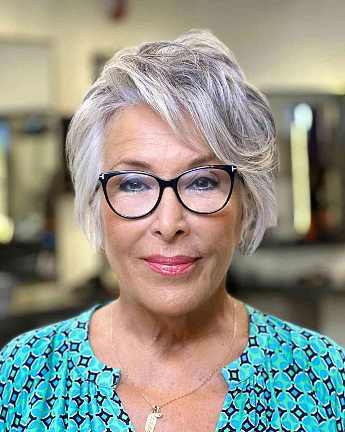 Are you concerned about managing your graying hair? If you desire a fun and lively hairdo, consider a short, feathered style enhanced by playful bangs.