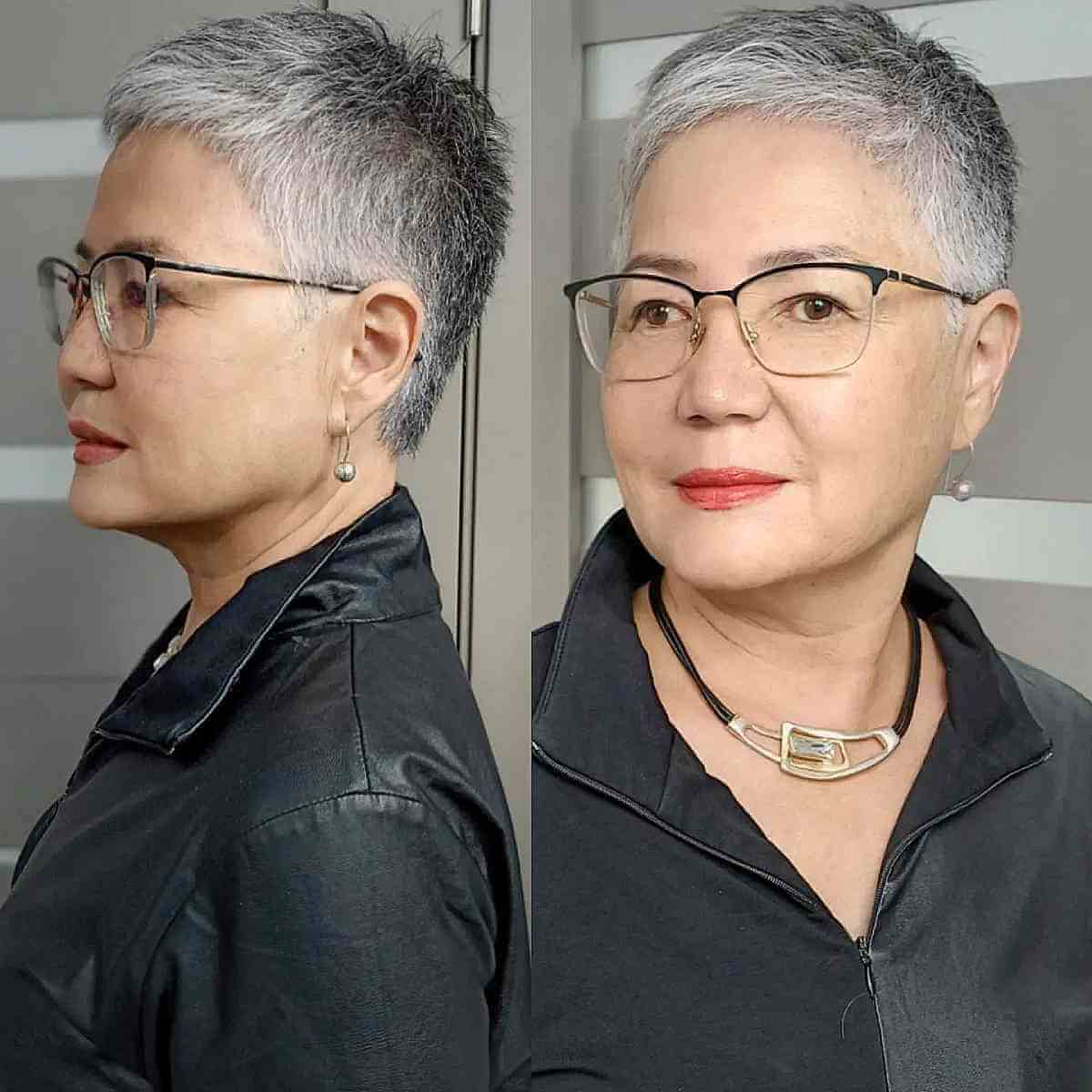 A salt and pepper short pixie hairstyle offers a fresh and chic appearance. Cut your aging hair short and it will be thick and healthy, and easy to manage. You won’t have any trouble with hair sticking out when you wear your glasses. That’s because this cut is tapered around the ears. So go bold with a short pixie and make your life less complicated.