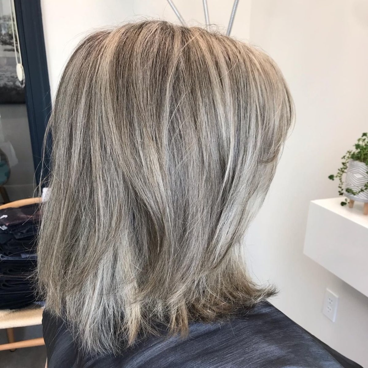 Elegant gray balayage with deep roots presents a contemporary approach to embracing natural grays. This hair coloring option often requires less maintenance compared to traditional gray cover-ups. For this look, it’s best to consult your color specialist to determine if you are a suitable candidate for this coloring technique.