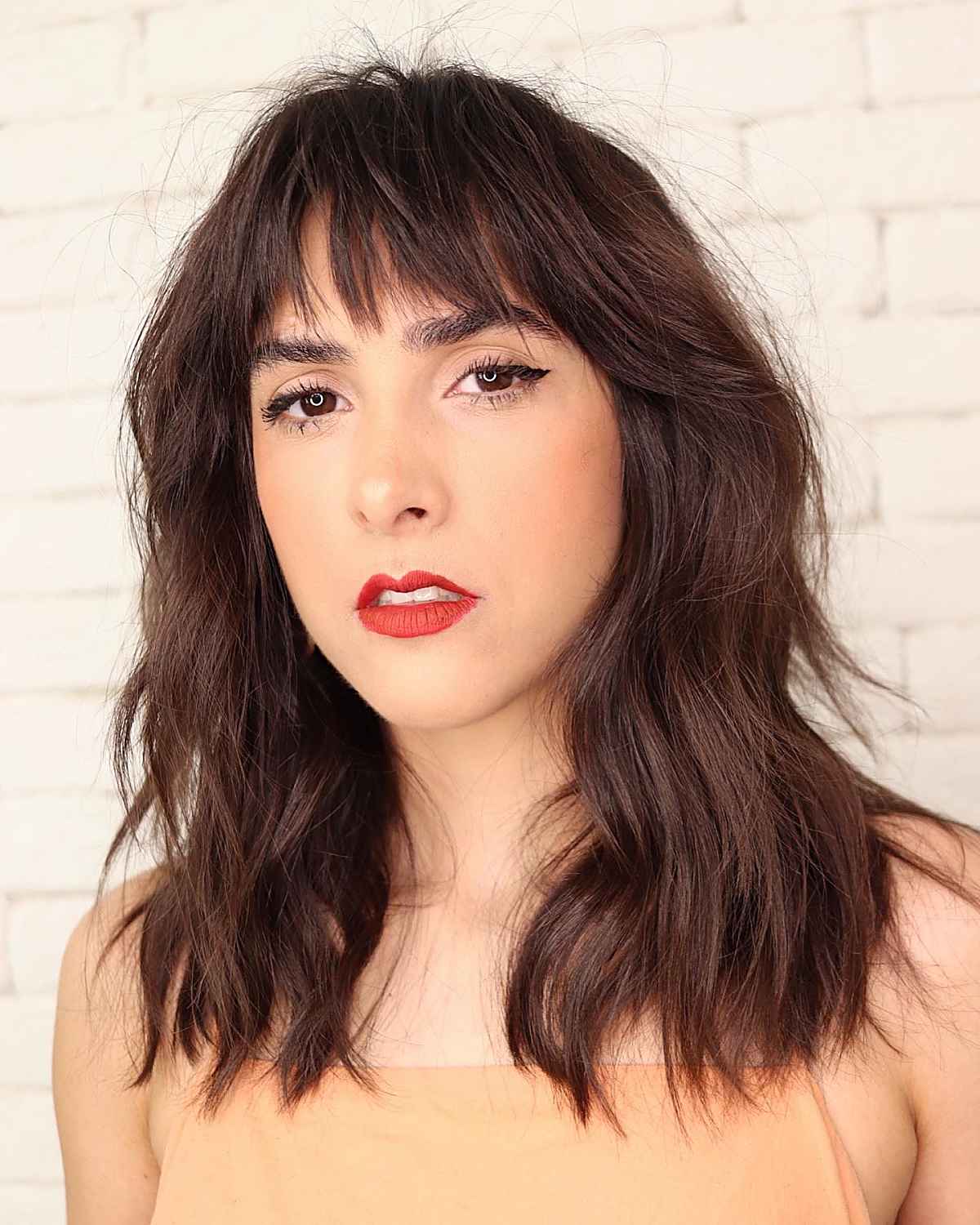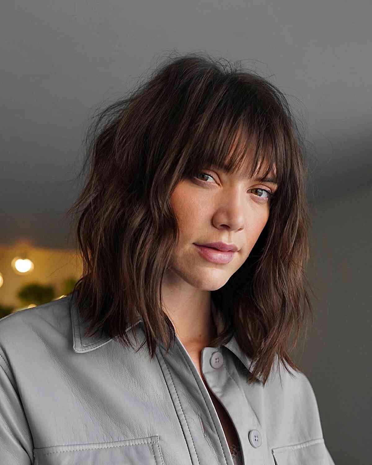 Opt for a long shaggy bob featuring bangs. This highly textured medium-length cut is perfect for medium to thick hair, helping to alleviate heaviness and straight edges. It complements long and triangular face shapes by encouraging your stylist to incorporate textured layers around the chin for a balanced appearance.