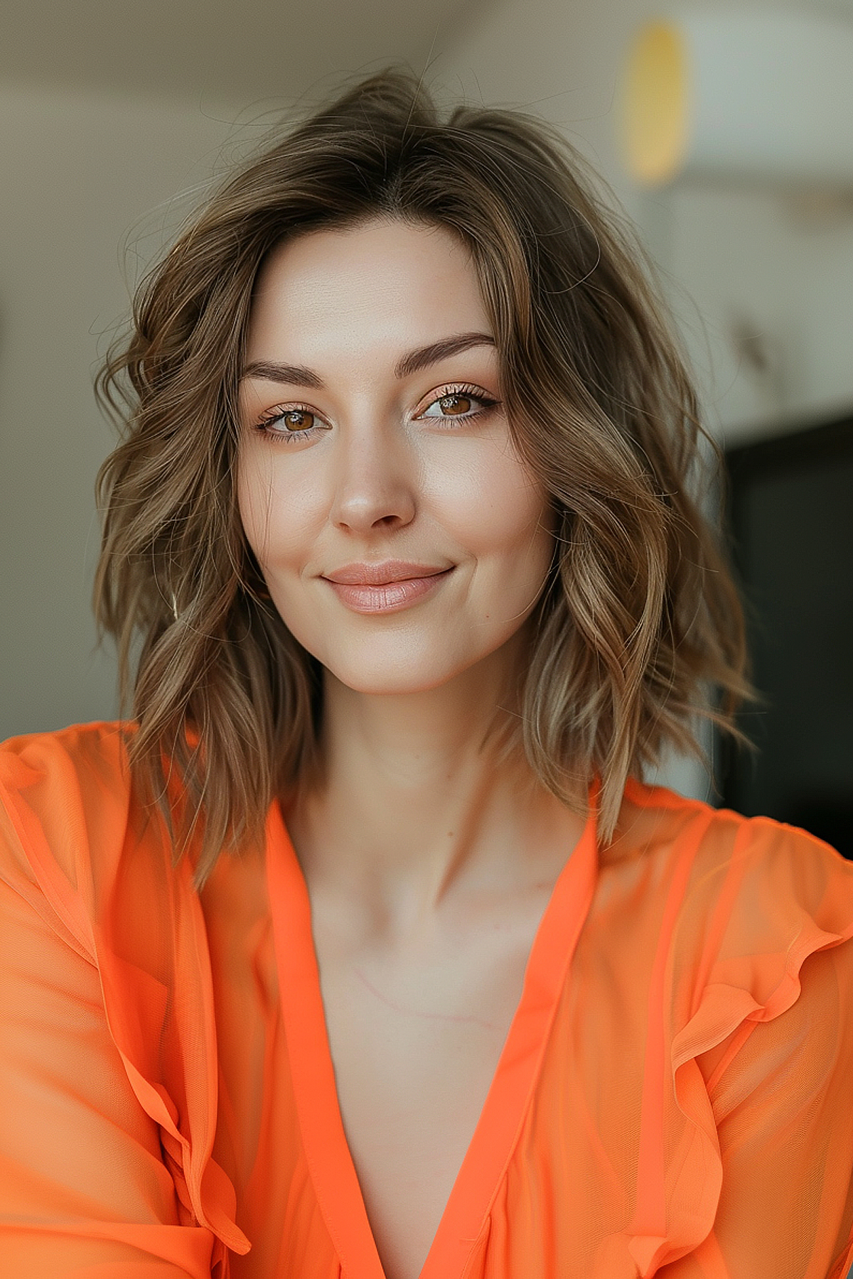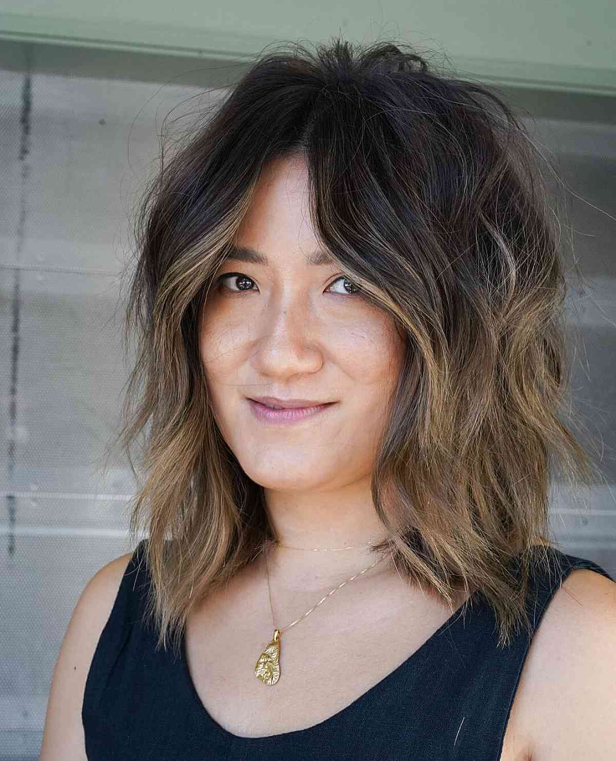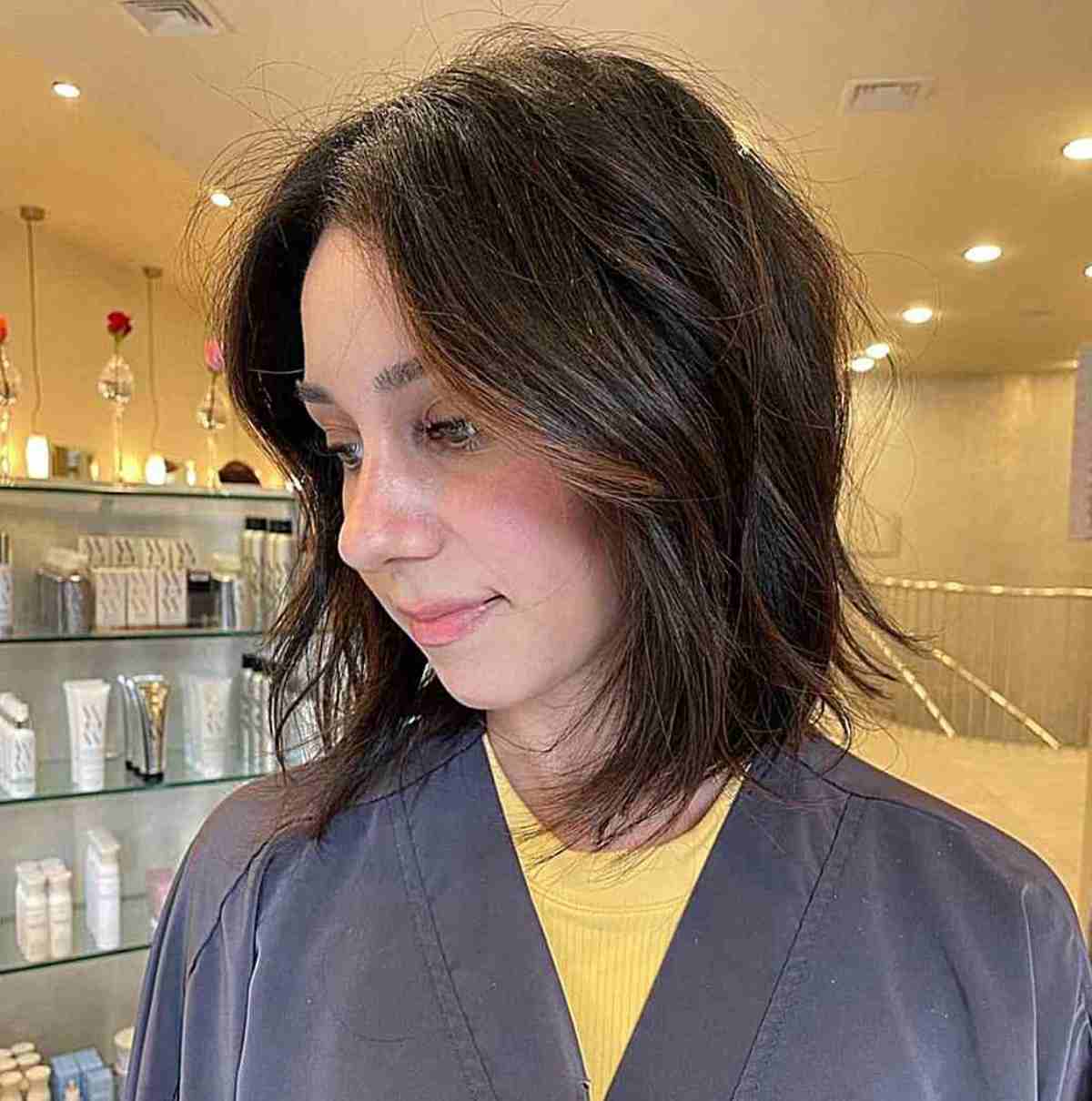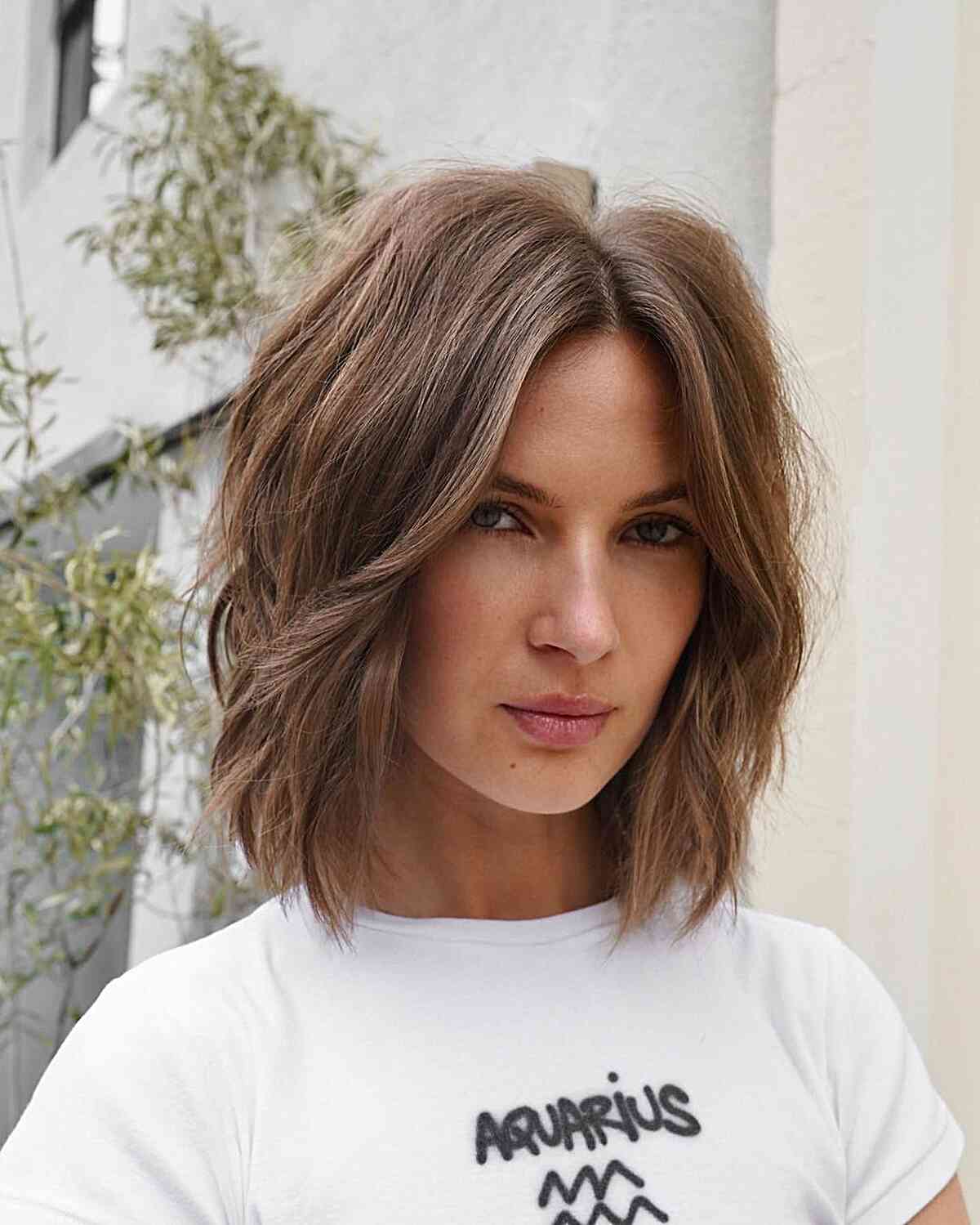 Consider a gentle, shaggy lob if you’re in search of a versatile and low-maintenance hairstyle. This haircut features layered ends and textured waves. It creates a relaxed and effortless look. The soft cut works well with various hair types and face shapes. It’s a hairstyle that offers movement and body to your hair, giving it a natural and carefree vibe. To style this look, use a curling iron or texturizing products to enhance the waves.