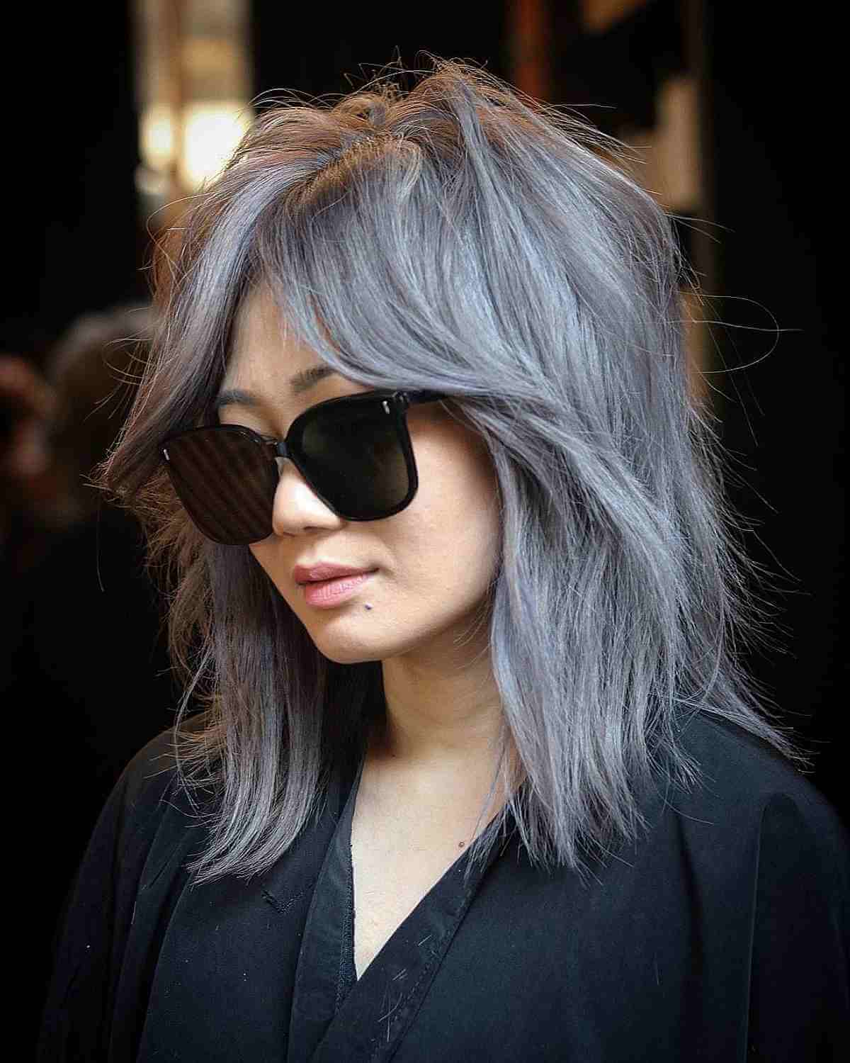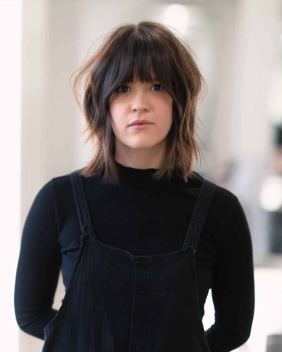 Are you loving this long, inverted shaggy bob, too? You’re not alone. This mid-length haircut is a lob with wispy bangs and subtle layers for natural-looking movement. This haircut looks chic in both straight and wavy styles. It goes well on hair with blonde teasy lights, too.