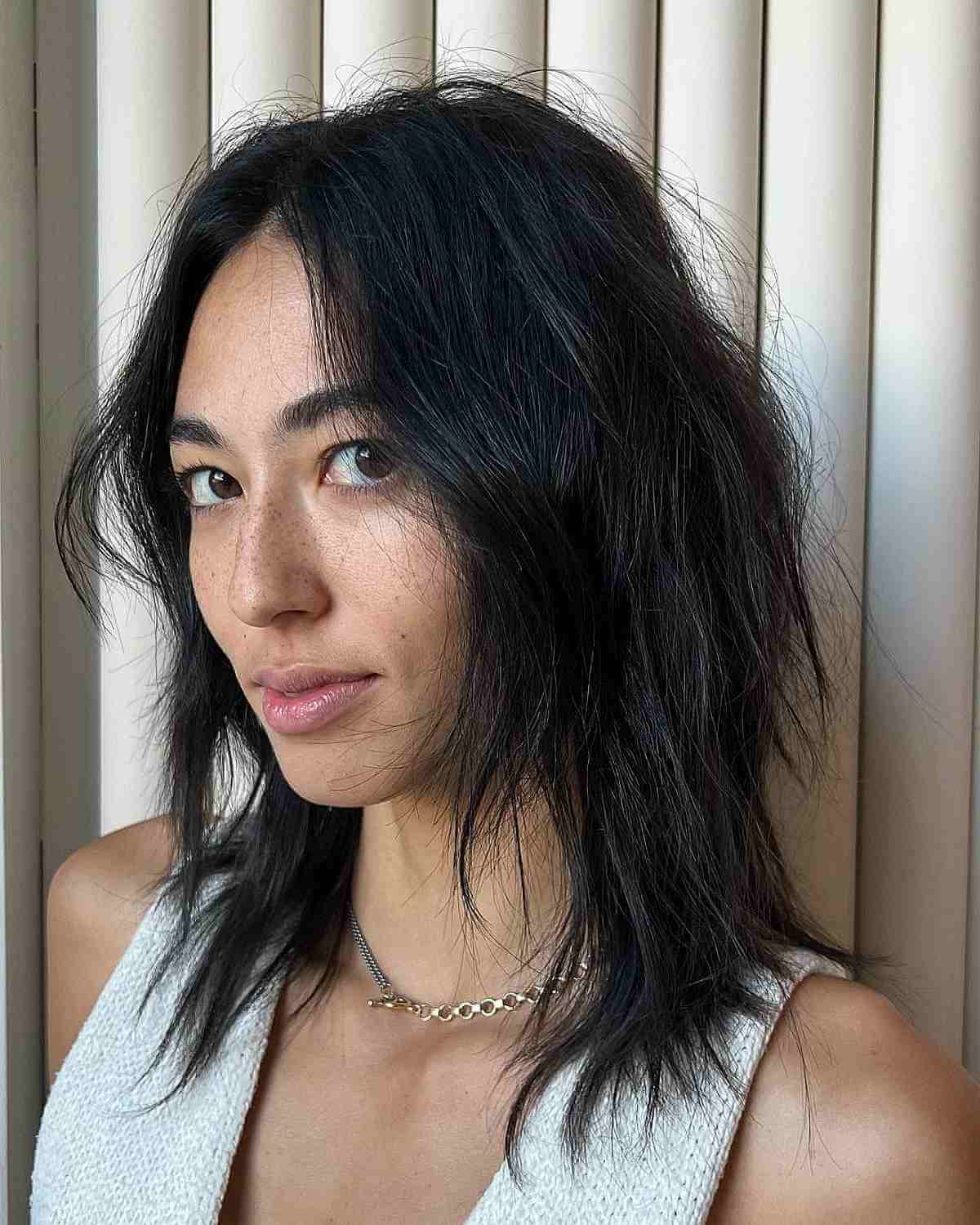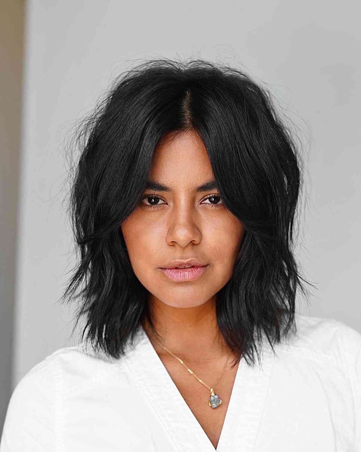 A textured choppy lob with a shaggy finish would be perfect for a fun mid-length cut. The shaggy ends add softness and movement throughout the look. With this in mind, consider a good length for your hair texture and density to keep this style easy to manage daily.