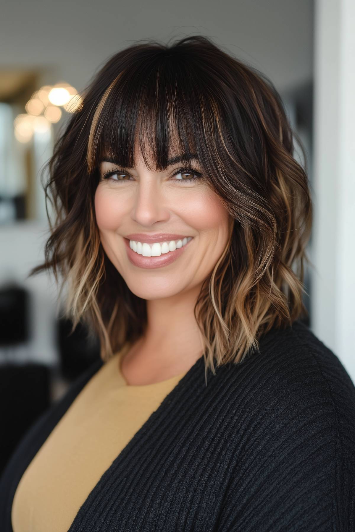 This layered lob with bangs is ideal for circular face shapes, providing a slimming effect through its face-framing layers. The cut features soft waves that add volume and movement, while the blunt bangs draw attention to the eyes and soften the overall look. The caramel highlights provide dimension, especially on medium to thick hair. This style is easy to maintain, requiring just a bit of texturizing spray for effortless waves, but regular trims will be needed to keep the bangs fresh.
