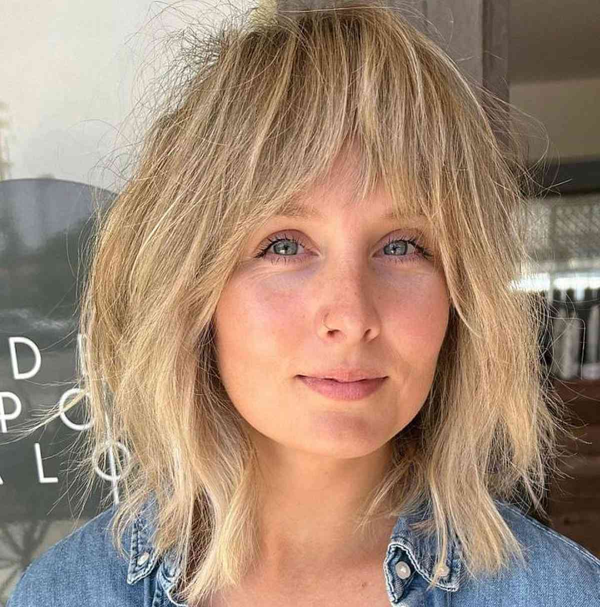 Chic Shaggy Lob with Straight Bangs for Round Faces