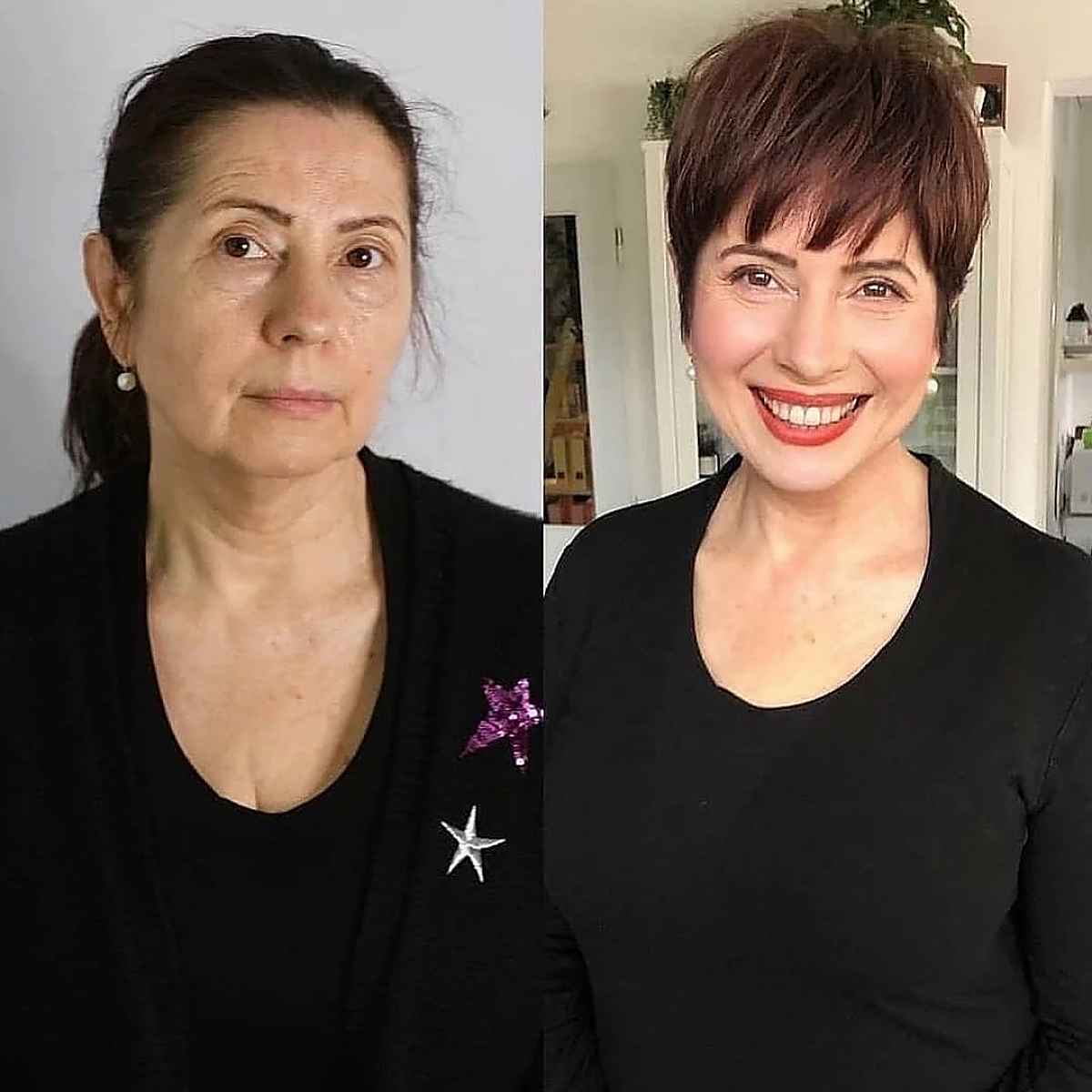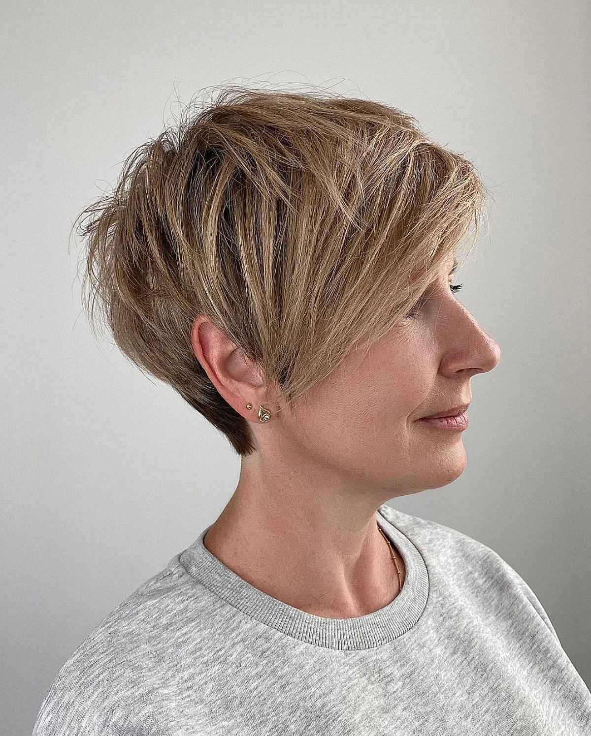 A chic pixie haircut for mature women adds a lot of fullness and texture to any hair type. Effortless cuts are flattering for a stylish woman who desires a playful look in minimal time.