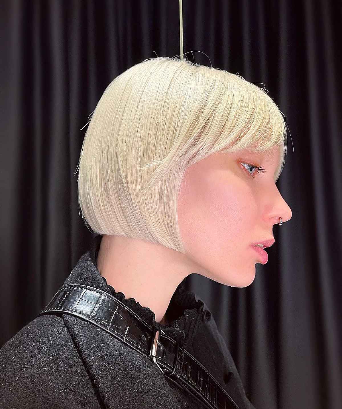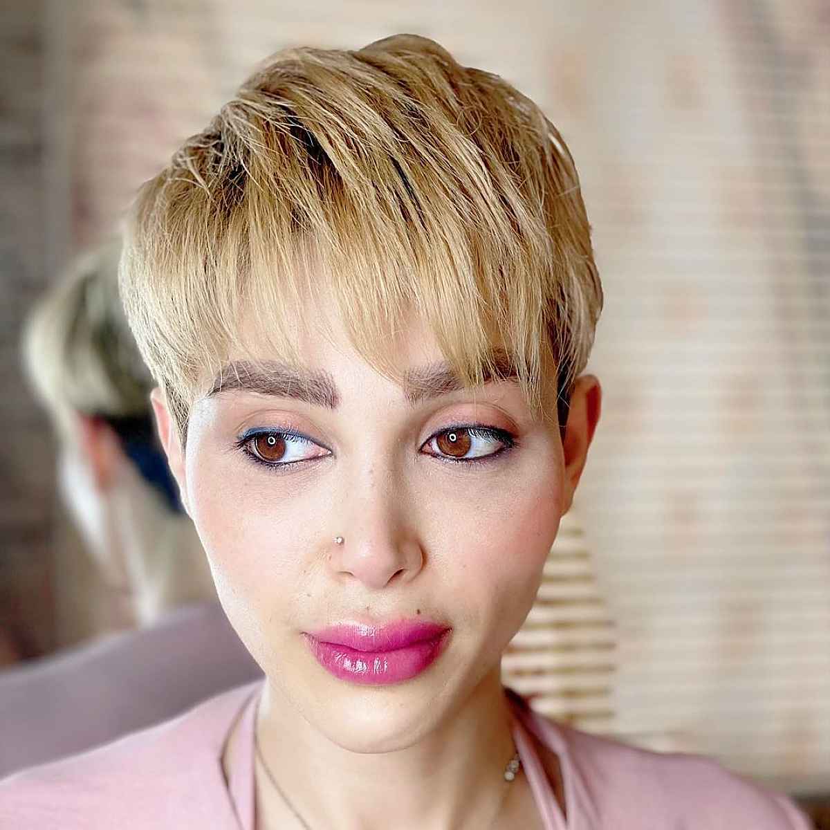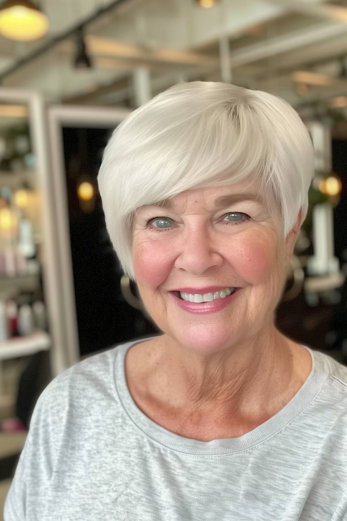 An effortlessly stylish pixie cut with bangs is a playful, tousled, and simple-to-style choice. Ideal for both fine and thick hair, these hairstyles highlight the eyes and are easy to maintain. Combine it with a vibrant platinum hair color to truly stand out!
