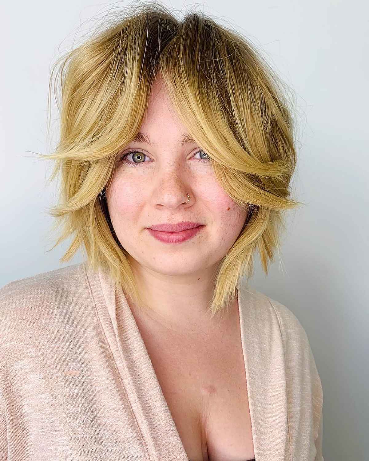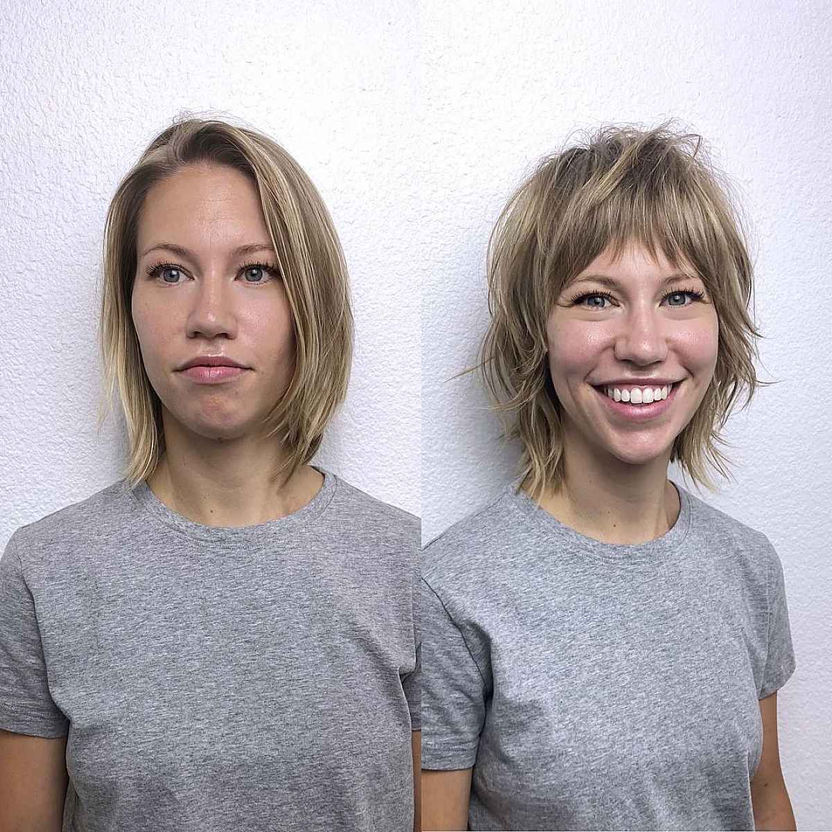 A low-maintenance shaggy cut with bangs for short hair is stylish and full of depth. Great for thick and medium hair, these styles are visually captivating and cannot be over-styled.