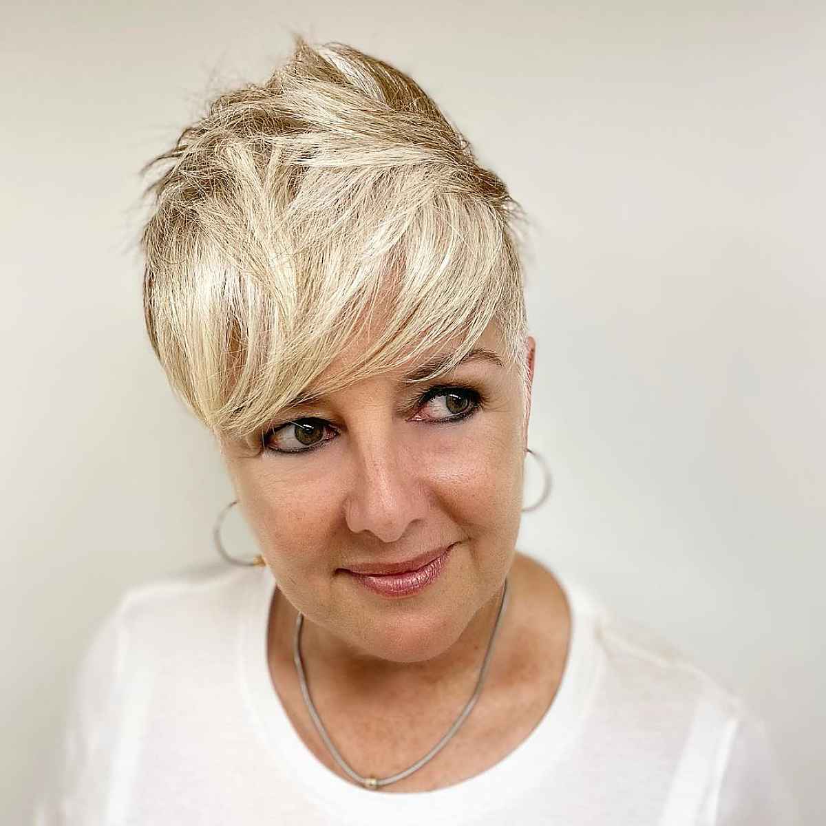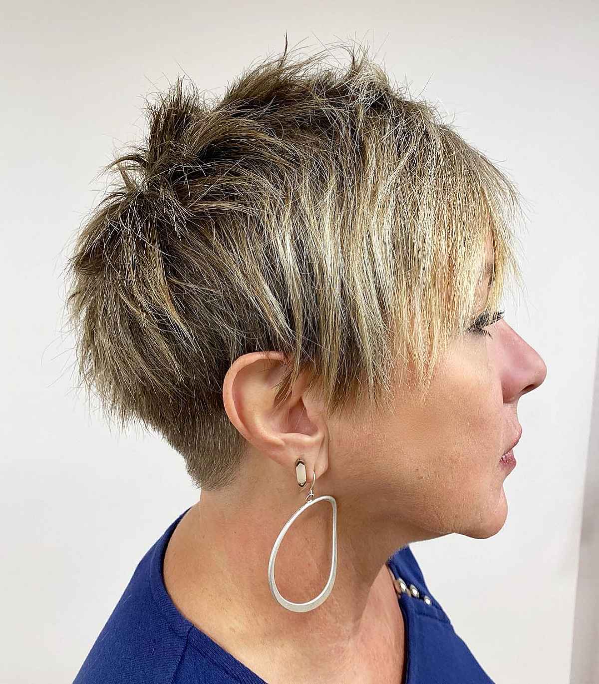 A tousled pixie cut is ideal for mature women. If you want to add texture to your pixie cut, I suggest styling it with a pomade. Use your fingers to mess it up, enhancing some pieces with the product. This look is great for a mature woman who desires to add a bit more edge to her style.