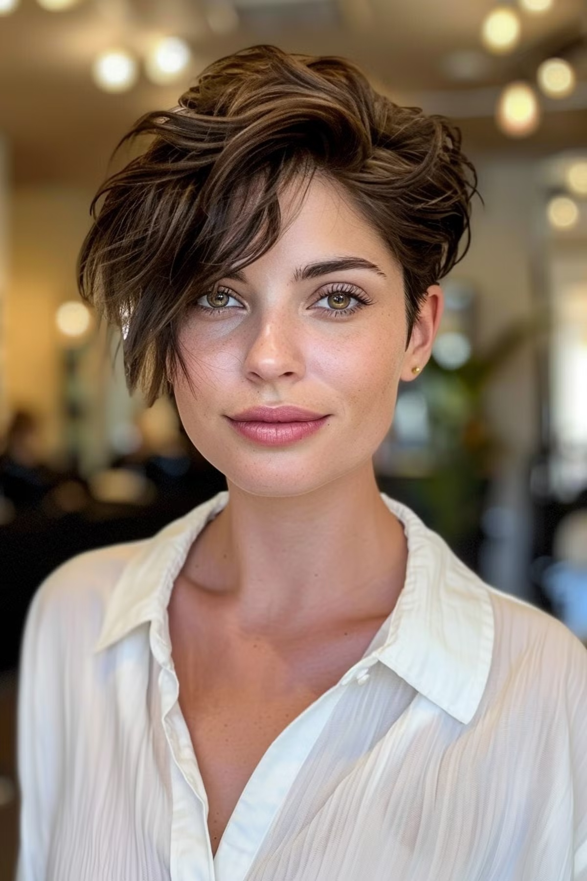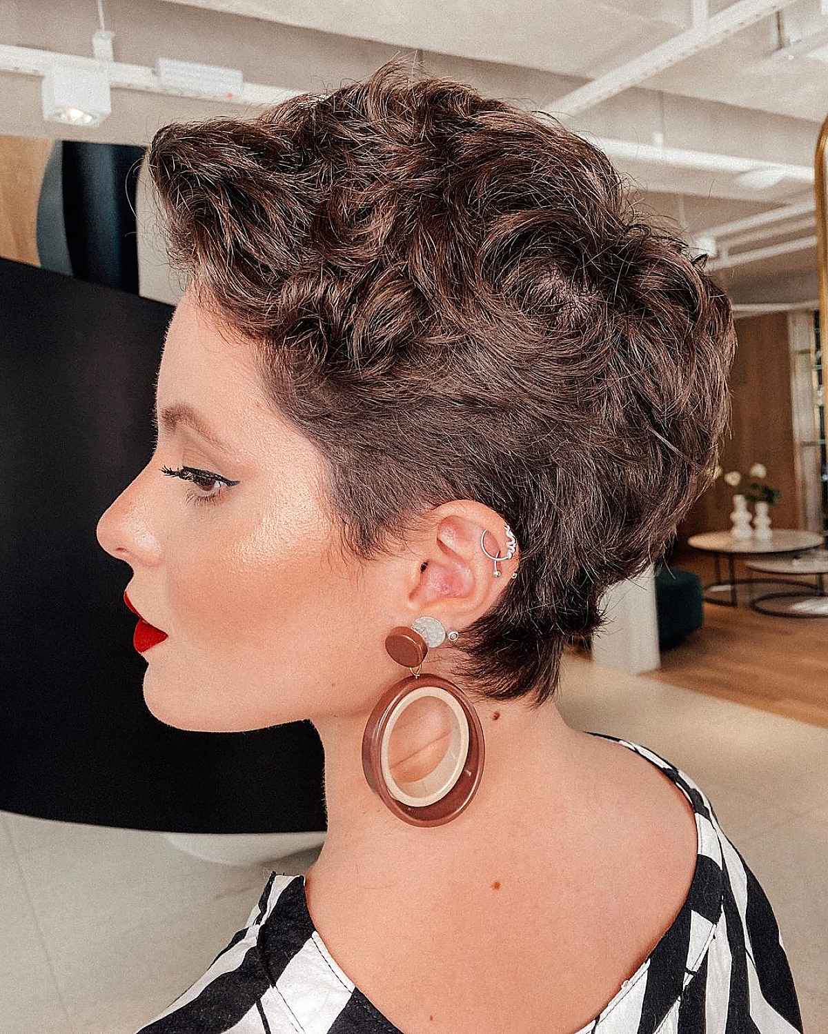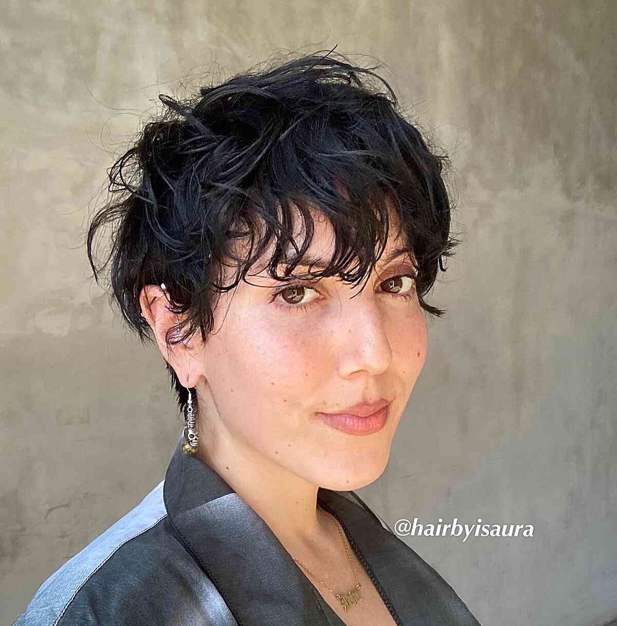 A pixie cut for tousled, curly hair is a low-maintenance haircut that only requires a curl cream and a diffuser when styling it. Messy pixie haircuts are popular as they offer an effortless, lived-in look.