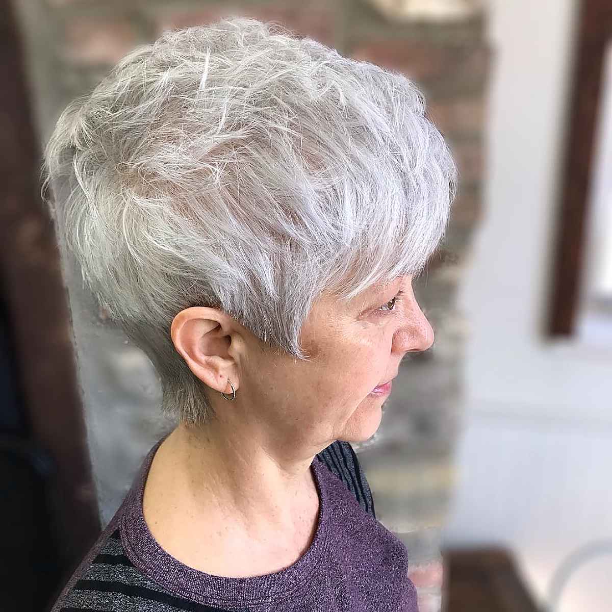 A grey pixie hairstyle for women aged 60 and above might be the ideal choice for you. Messy hairstyles are versatile and gentle, highlighting your femininity even more. Consult your stylist to see if a messy, textured cut will suit you!