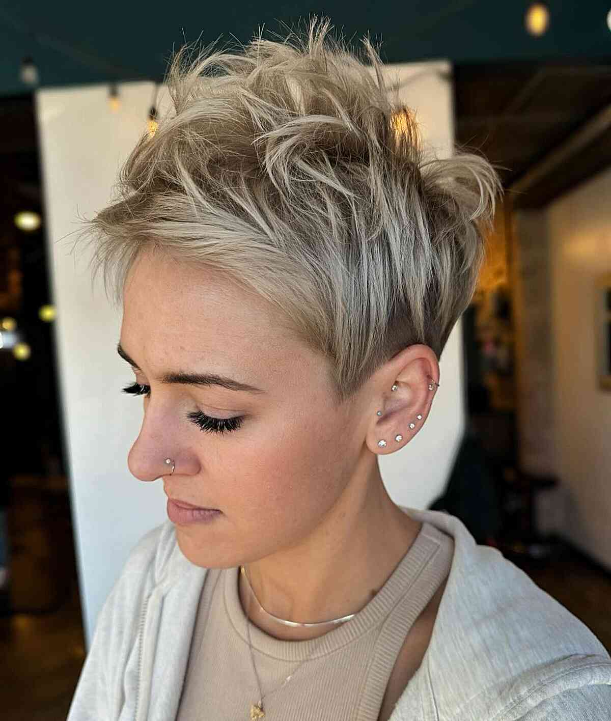 Explore a pixie with shaved sides for a striking and stylish hairstyle. This haircut merges a short pixie cut, shaved sides, and a disconnected top for added length. This style is ideal for those with fine or thin hair seeking to opt for a shorter look. It showcases longer, tousled top layers that contrast beautifully with the shaved sides, resulting in a bold and vibrant texture. This is an excellent choice for anyone wanting to adopt a daring and unique aesthetic.