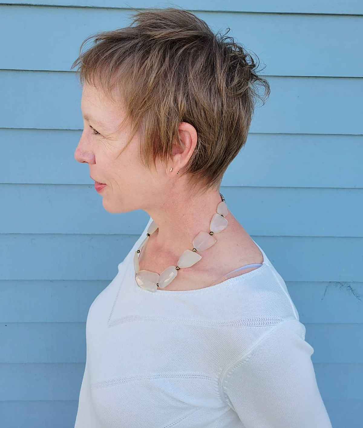 Hairstylist Maria Mazzocchi from Stones Corner, BNE, assures that pixies complement most women. “This haircut is fantastic regardless of whether you’re young, middle-aged, or even in the senior age group. The texture of natural grays mingling with a pixie crop can always create a striking appearance.”
