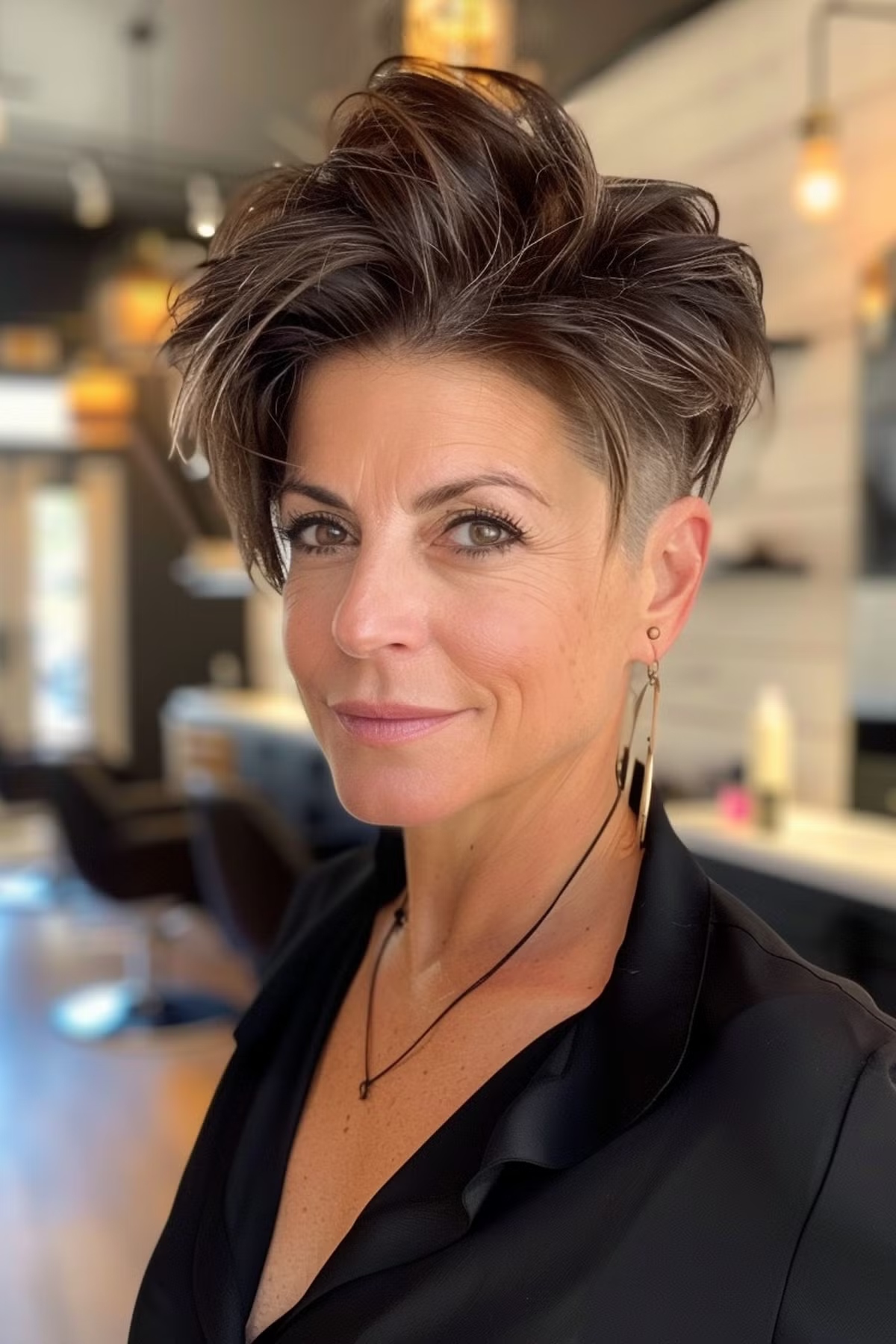 A trendy, tapered pixie cut for women over 40 is a perfect choice for those looking to stand out from the crowd! Pixie haircuts are messy and edgy, creating a lived-in, modern look. This hairstyle will make you feel both feminine and stylish at the same time!