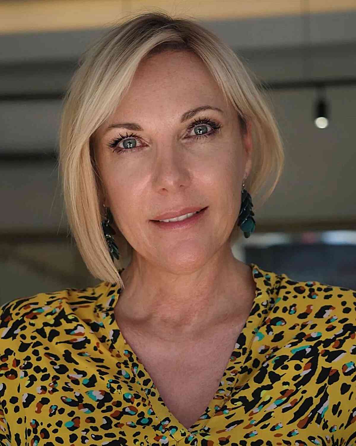Sleek Blonde Asymmetric Bob Featuring Delicate Bangs