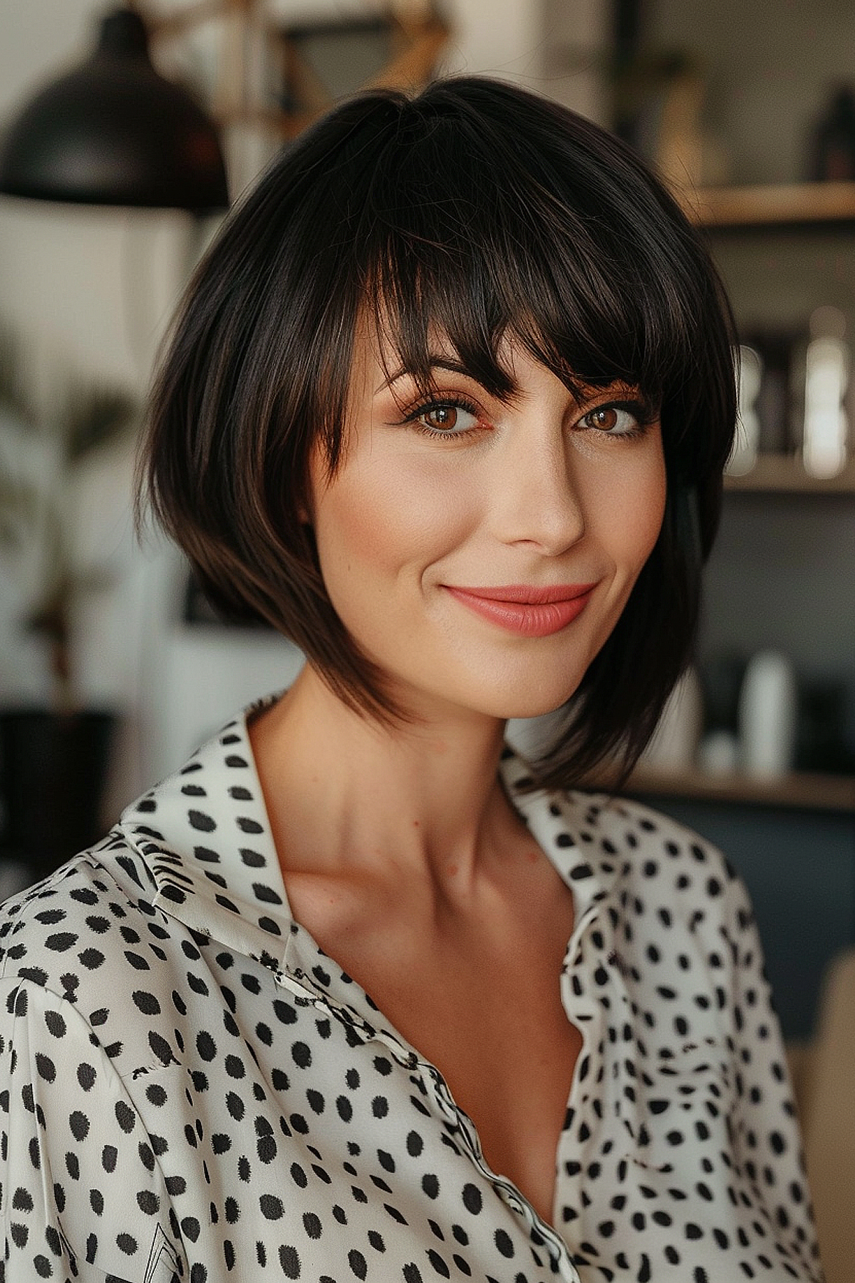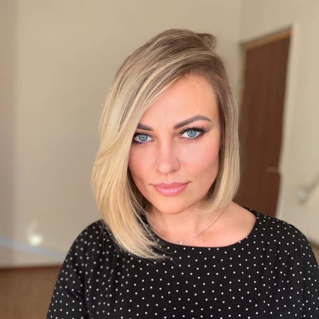 Consider a chic asymmetrical blunt bob that is subtly inverted. A short asymmetrical bob cut is simple to style and maintain. The short, blunt features complement nearly all women.
