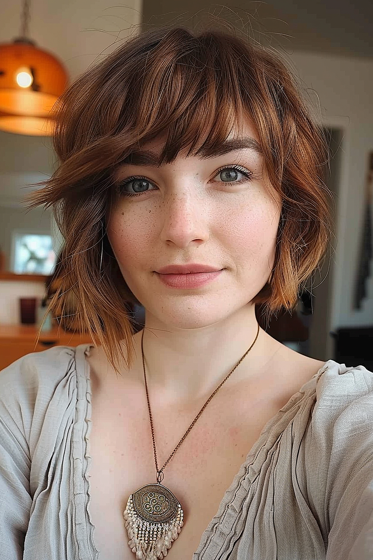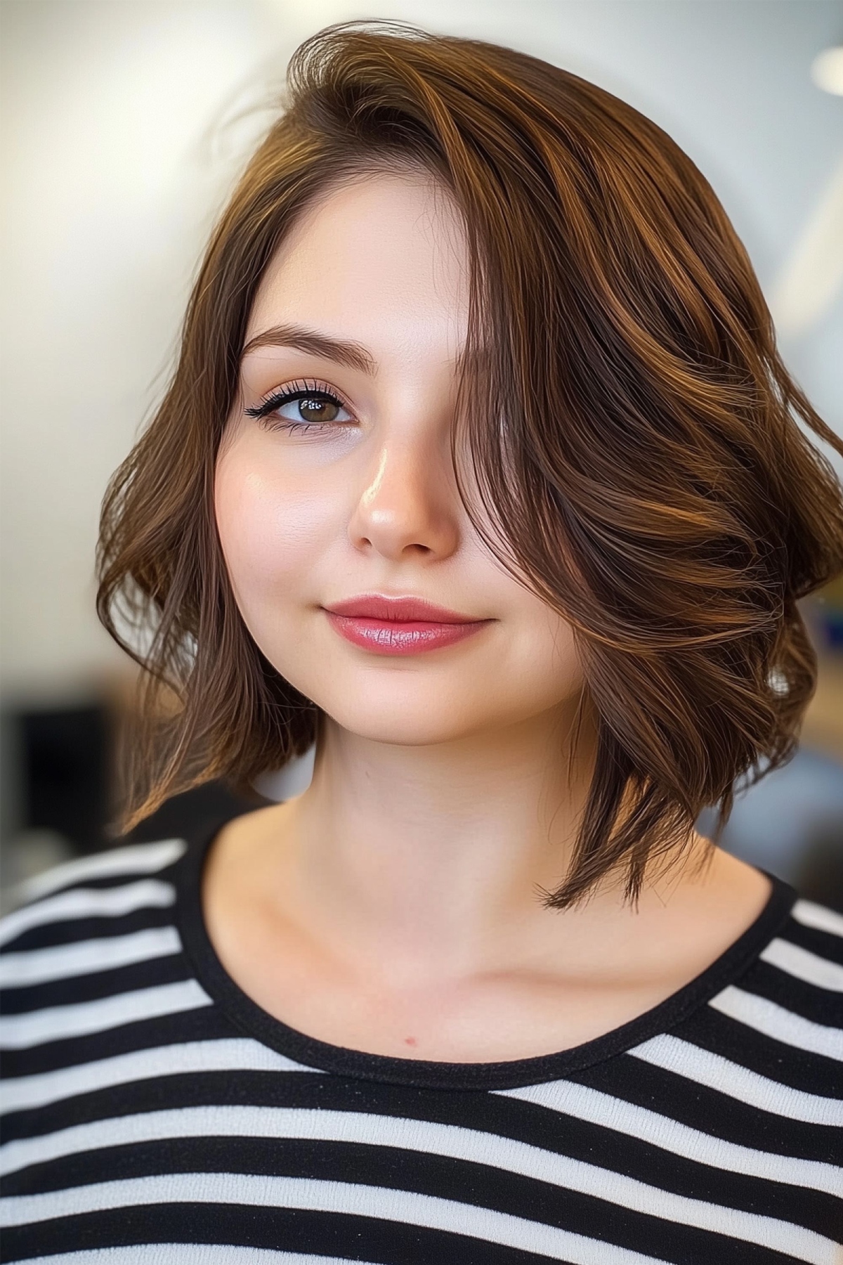 This chic short asymmetrical bob with bangs is ideal for those seeking a fashionable yet effortless appearance. The choppy layers and textured ends provide volume and movement, perfect for fine to medium hair. The bangs introduce a playful element, framing the face beautifully. This cut is suitable for most face shapes and pairs well with a natural wave or slight curl, ensuring versatility and ease of styling. The asymmetry brings an edgy flair, while the overall look remains soft and inviting.