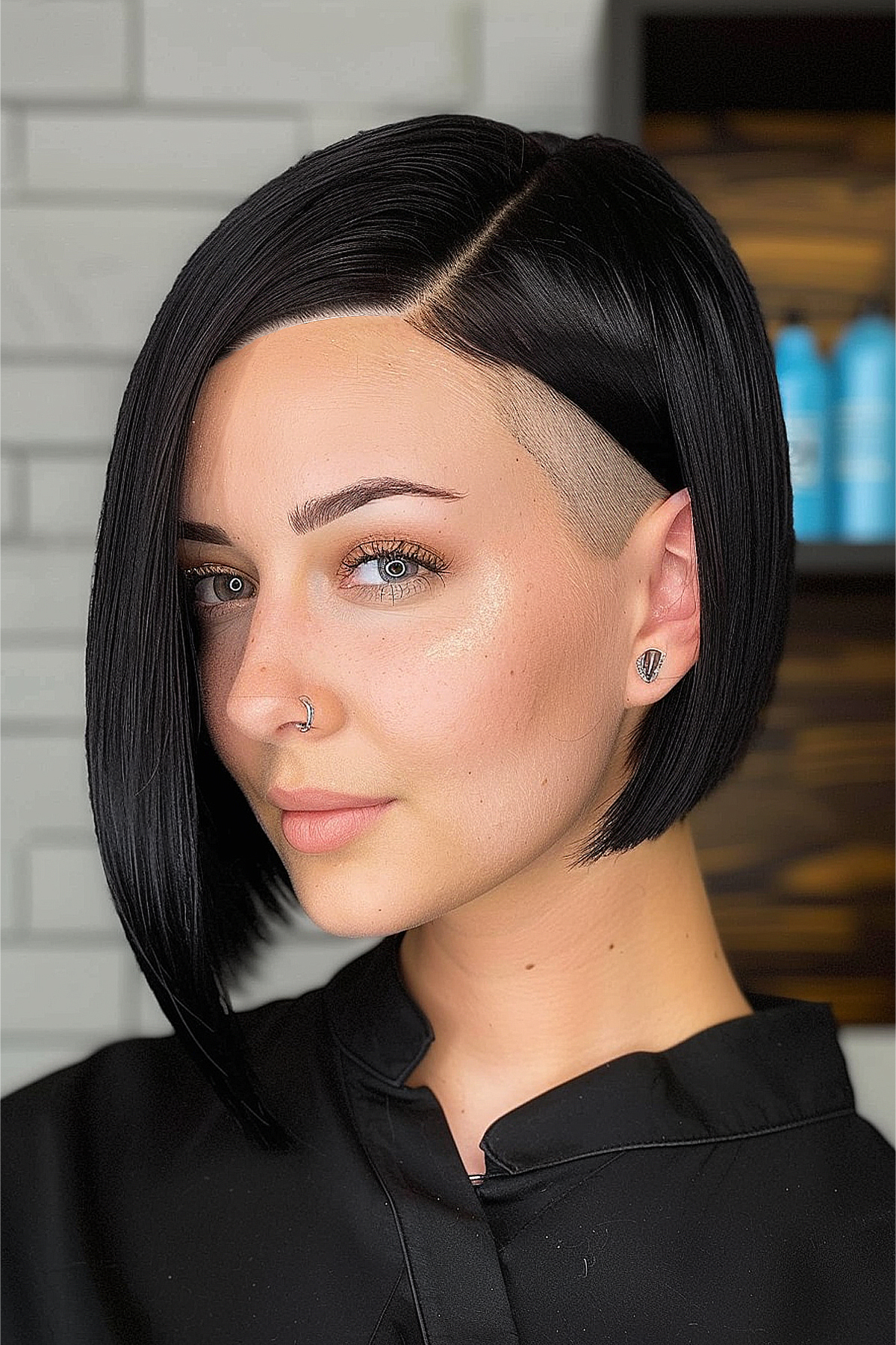 This stylish black short asymmetrical bob with an undercut is perfect for those pursuing an edgy yet refined look. The haircut features a sharp asymmetry with one side longer than the other, adding a contemporary twist. The undercut on one side makes a striking statement, making it ideal for women who want to be noticed. This style works best on straight hair, accentuating the clean lines and precise cut. Maintenance is minimal, requiring regular trims to keep the shape crisp and polished.