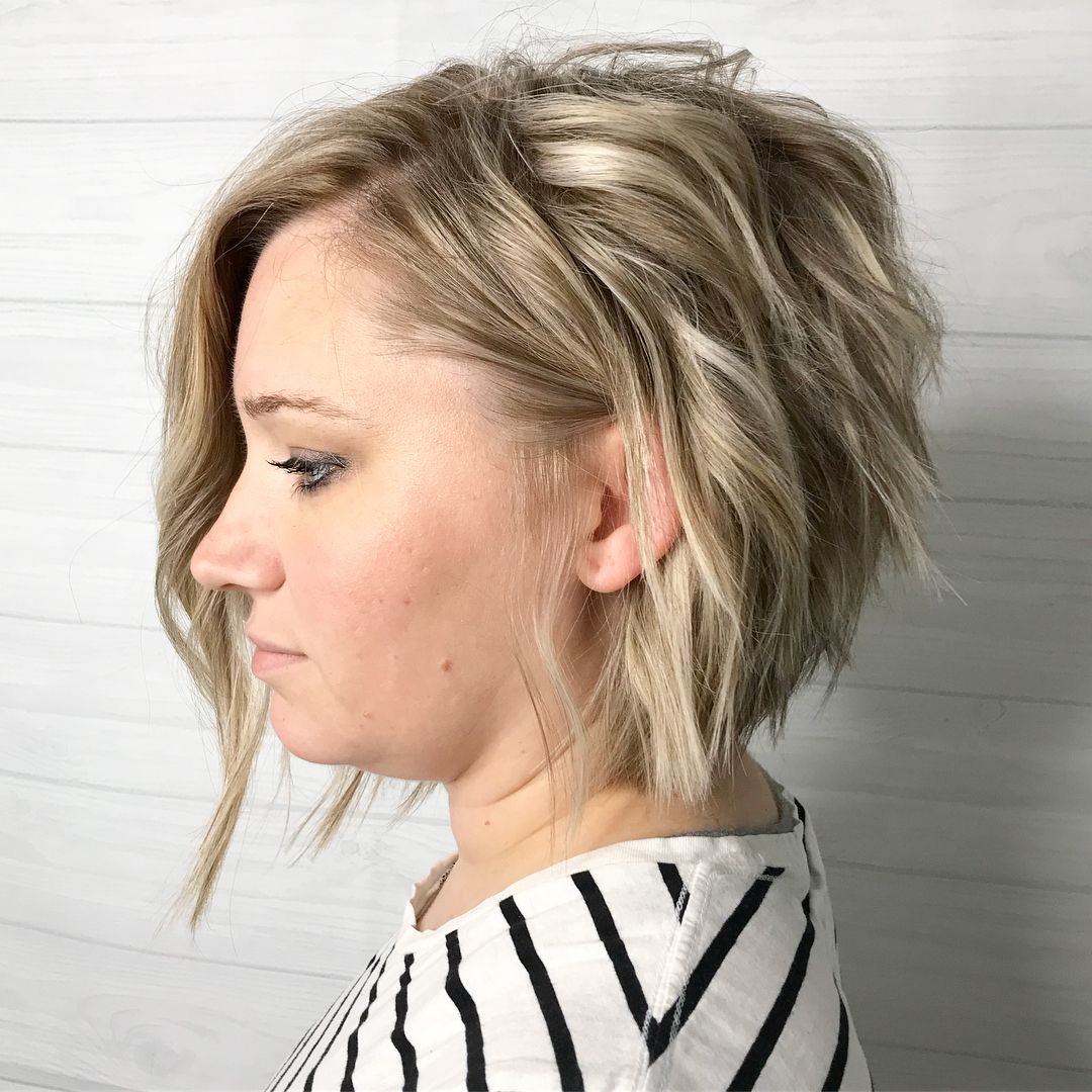 A textured asymmetrical bob on short hair is much better, featuring plenty of waves. The result creates a tousled appearance, providing the illusion of increased volume and thickness. When finishing the look, employ a sea salt spray to enhance the texture.
