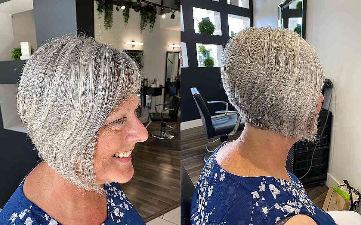 When an asymmetrical short bob with layers is styled in a silver hue, the result is absolutely breathtaking! Observe how this hair concept exudes such elegance. The shade of gray looks more pronounced with a short cut like this on thicker hair. This bob is an excellent choice for women with a round face shape.