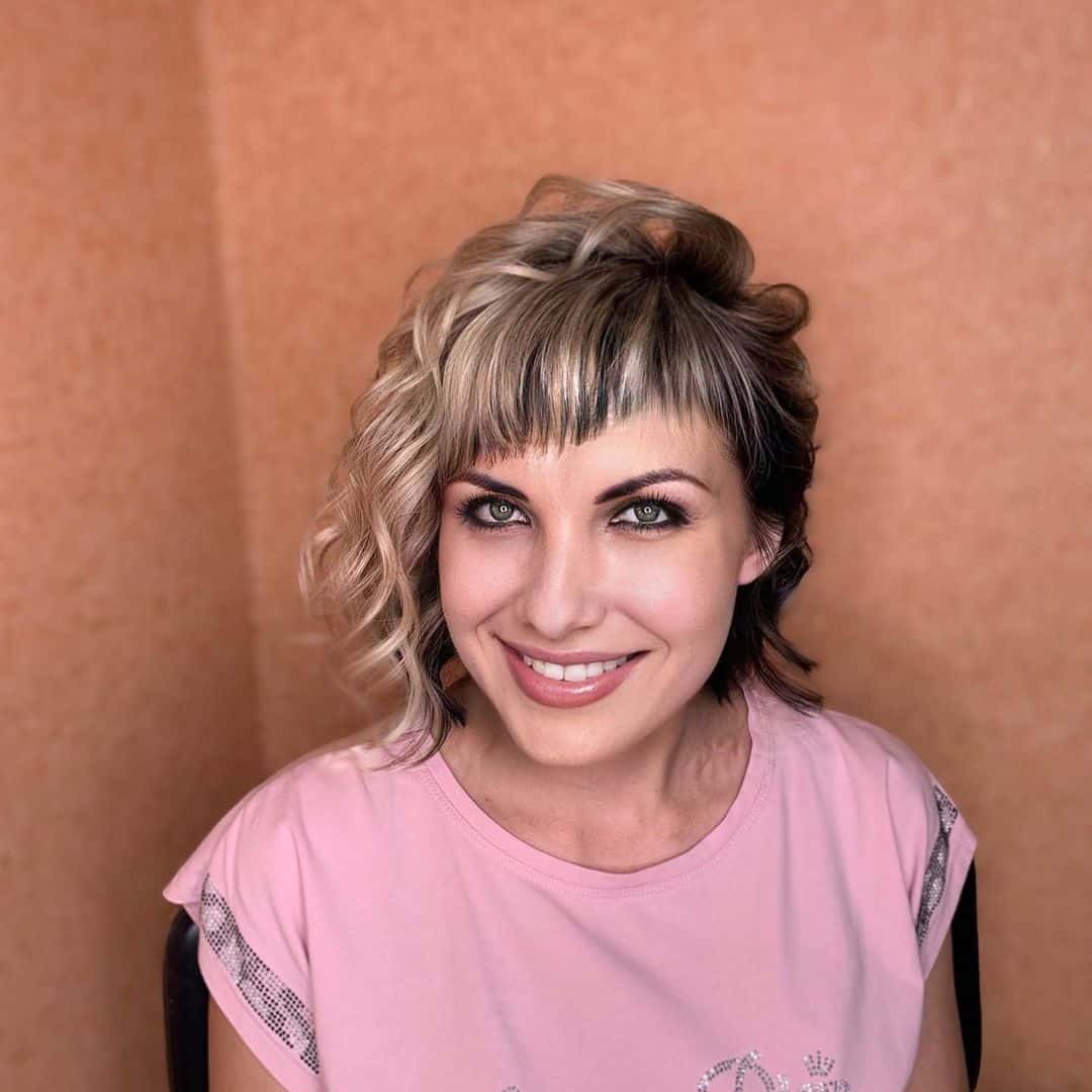 This is a stylish asymmetrical curly bob, and it’s an even more fabulous iteration of the classic bob! Most curly hair is swept to one side, creating an unconventional flair. It features a beige-blonde tone with a natural black hue underneath.