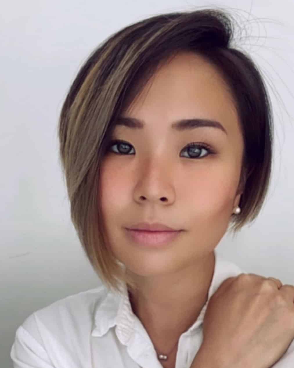 A chic short asymmetrical bob with a side part is incredibly stylish. A bob remains timeless, and the asymmetry adds a unique touch. Enhance your look with this elegant minimal style.
