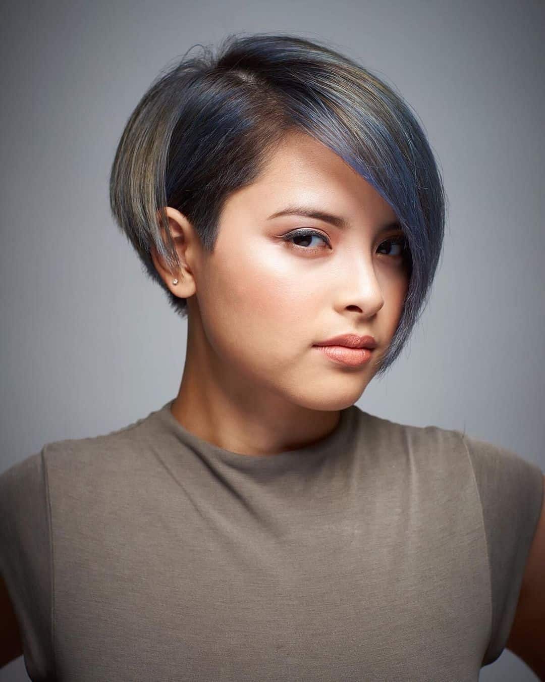 An elegantly short asymmetrical bob enhances thin, fine hair, making it look fuller. The asymmetric chop carves out a beautiful rounded silhouette that complements a square face. Beyond its captivating cut, the touches of blue are striking. The added color accentuates the cut even more.