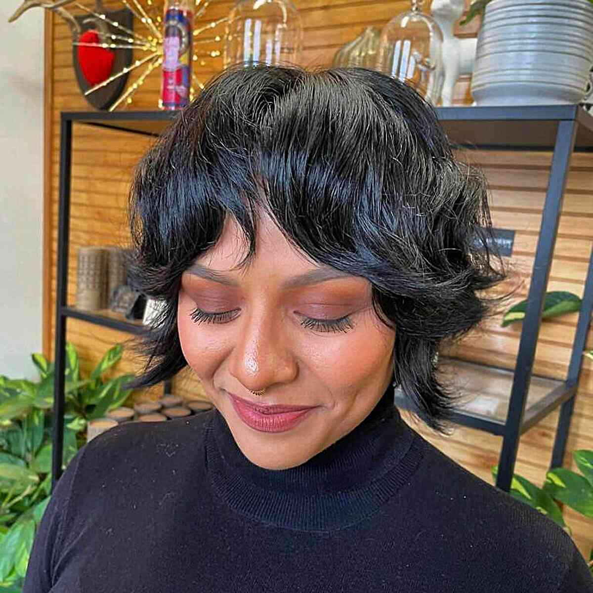 Are you in search of a trendy short hairstyle that pairs beautifully with curtain bangs? The skillfully styled bangs and neatly trimmed ends will accentuate your facial features.