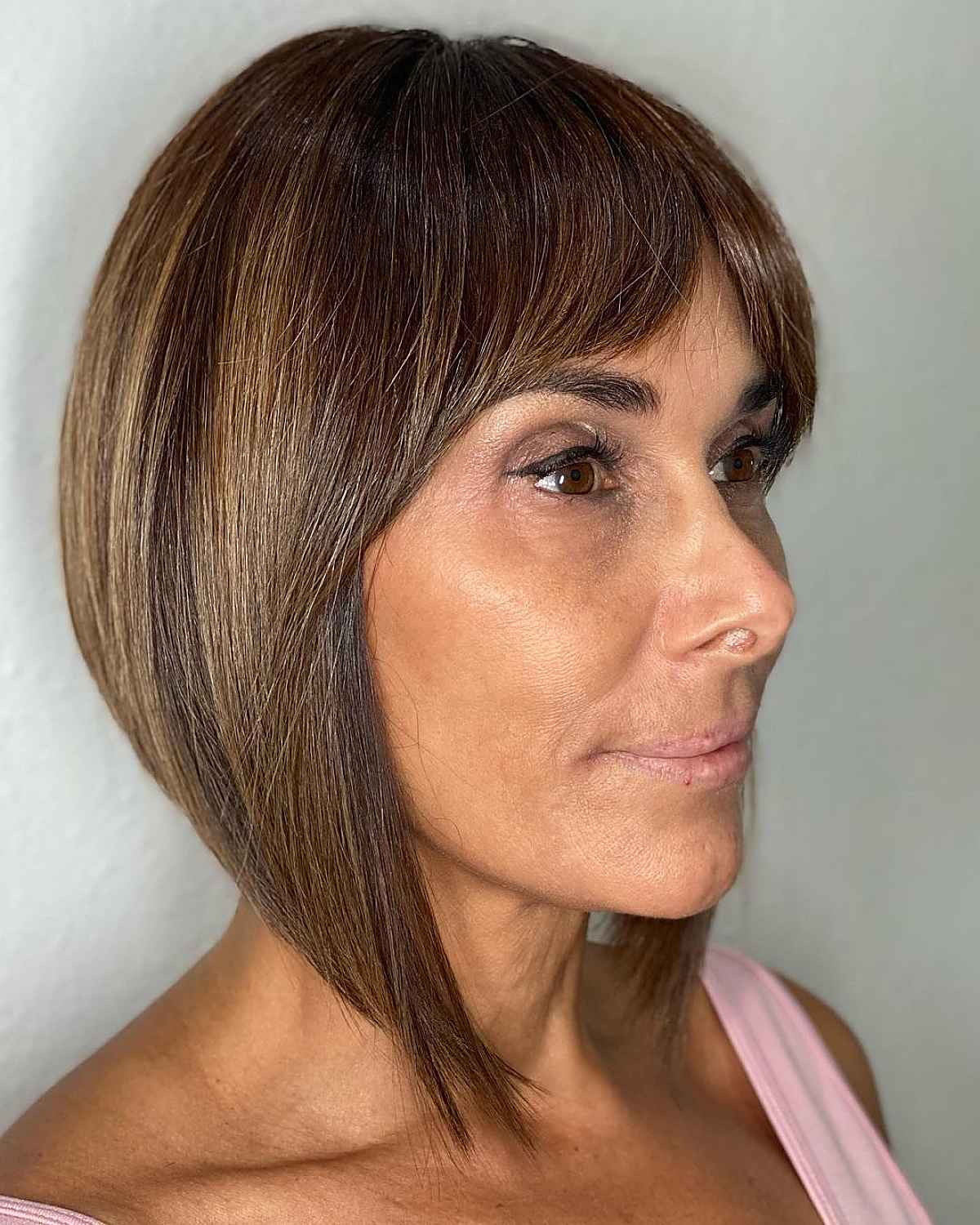 Stylish bangs for women over 50 take years off your appearance. Short fringe is a fantastic choice to balance out longer face shapes, especially when coupled with a chin-length cut.