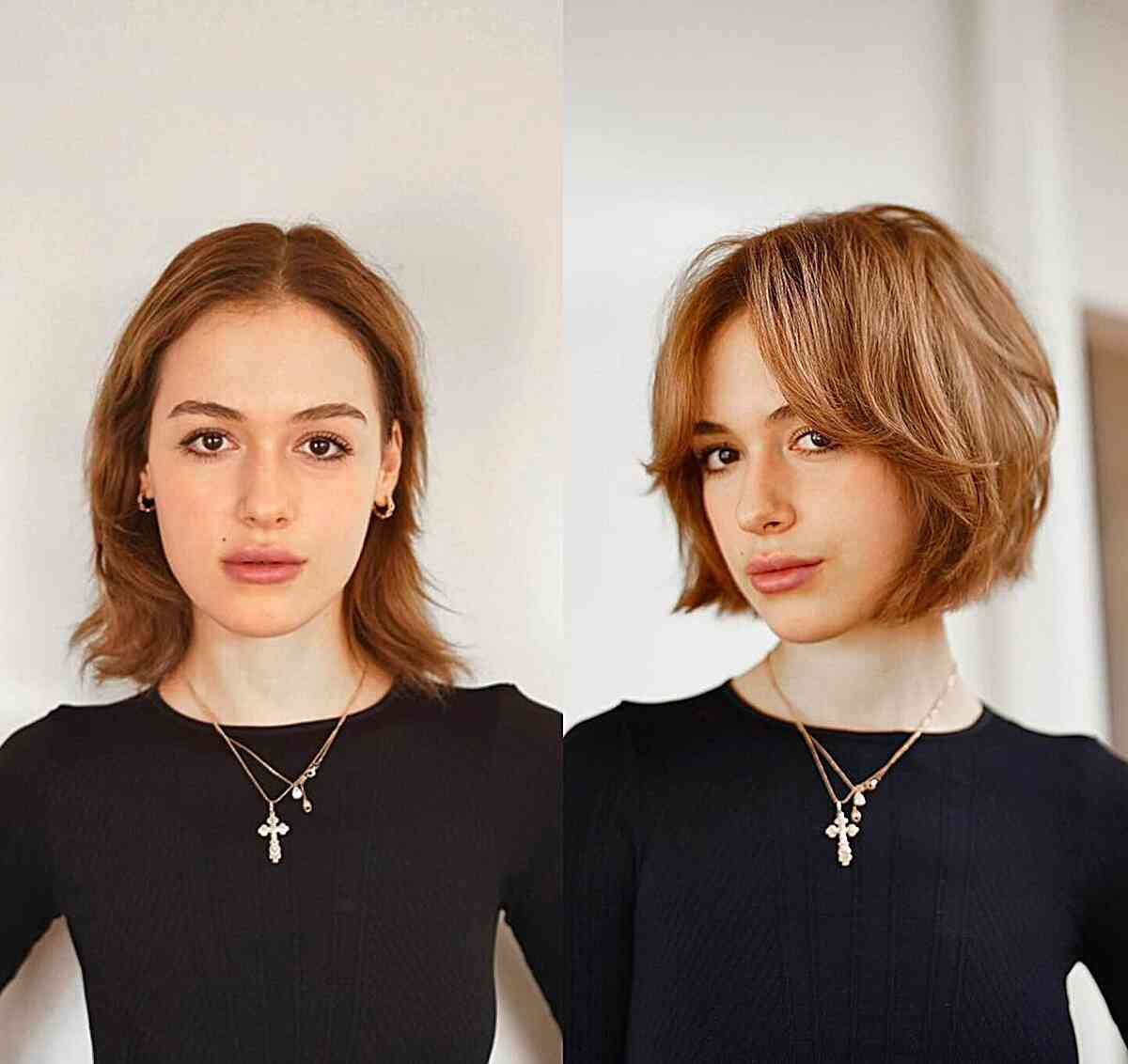 Transform your short hair with warm brown-auburn shades and curtain bangs. This fringe beautifully emphasizes the rich red and gold hues in your style. Keep in mind, you can customize the balance of auburn and brown according to your preference and maintenance routine.