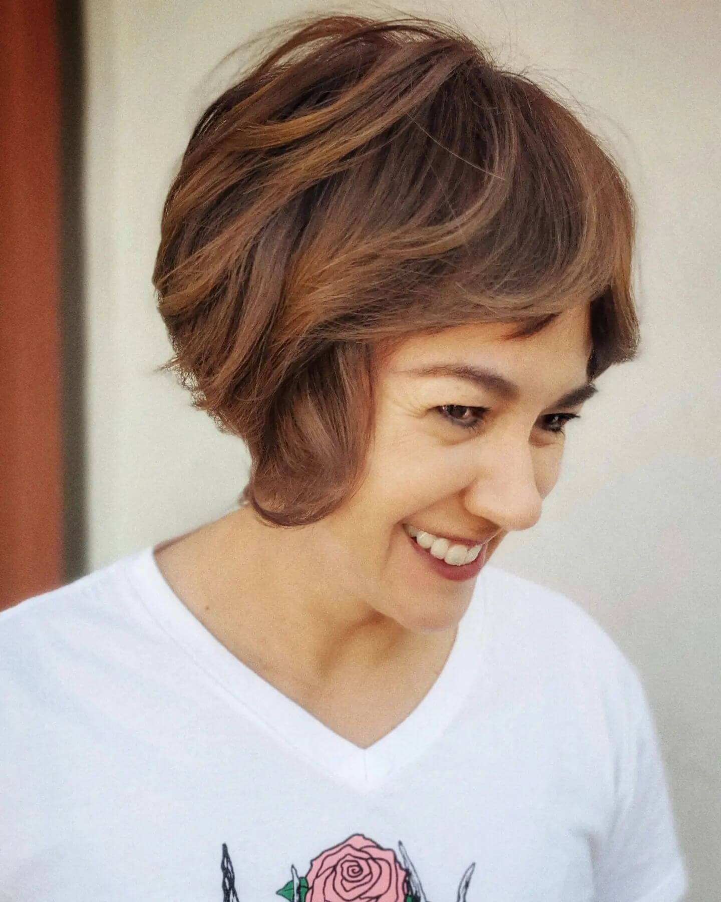 #27: Chic Short Layered Hairstyles with Curtain Bangs for Women Over 40