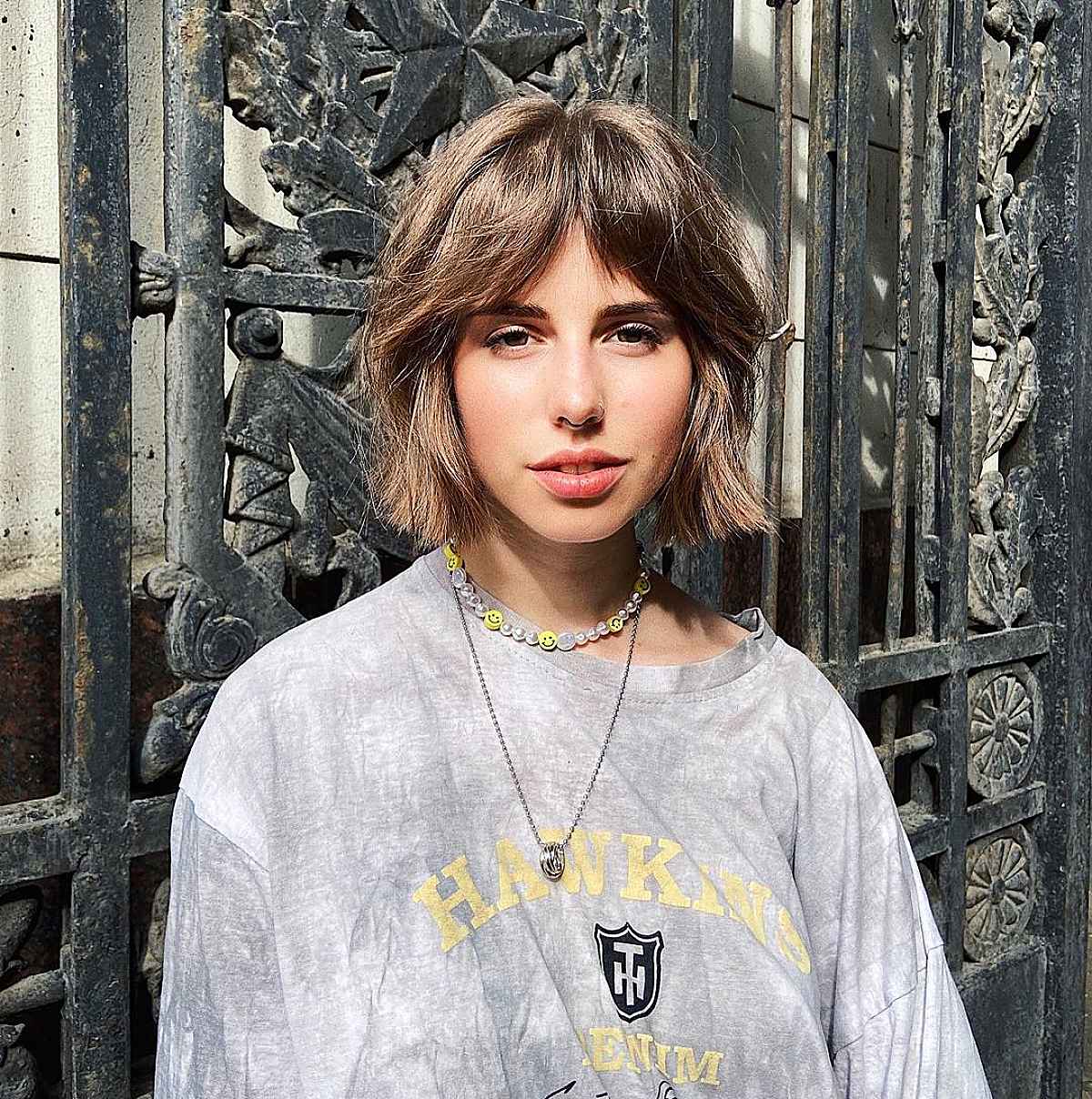 A chic short haircut with extended curtain bangs is ideal for creating a face-framing silhouette. The longer fringe grazes the nose and enhances rounder facial features. If you’re hesitant to fully embrace a complete fringe, this length seamlessly grows out. Short haircuts can transform your damaged hair into a healthier, more vibrant look.