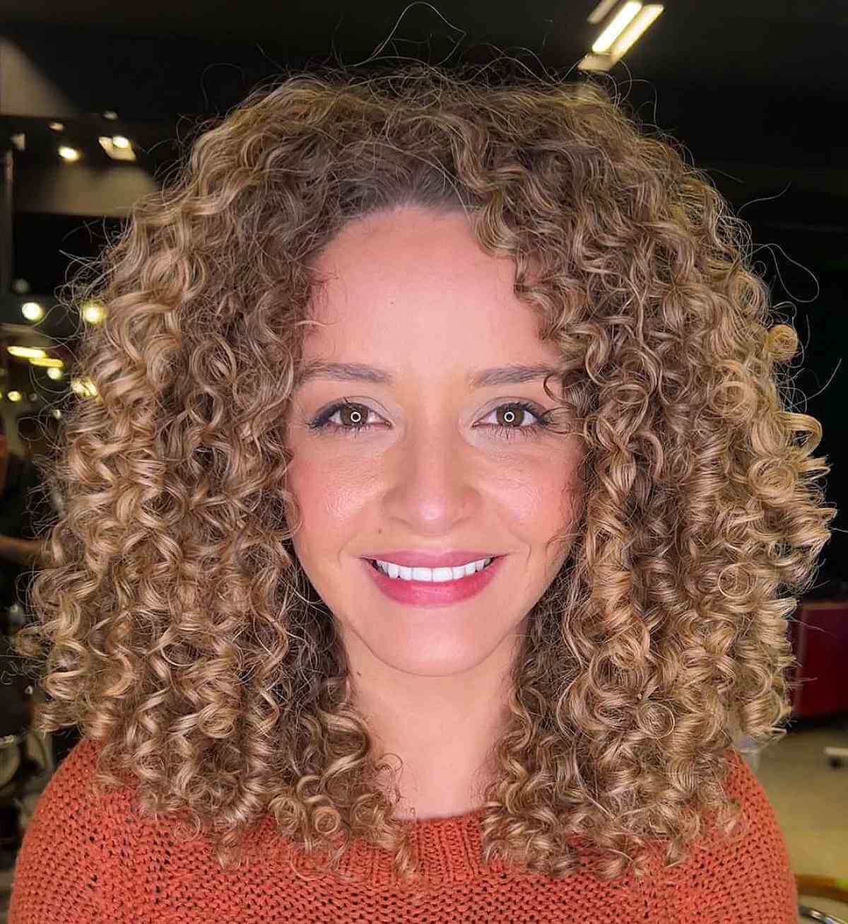 Explore the beauty of golden hair featuring natural spiral curls. A timeless round layered cut is perfect for spiral curly hair. Consult with your stylist about cutting your hair dry to observe the position of your curly coils. It’s ideal to arrive with your hair in its natural form, free from ties or bends, to provide your stylist with an accurate view of your curls.