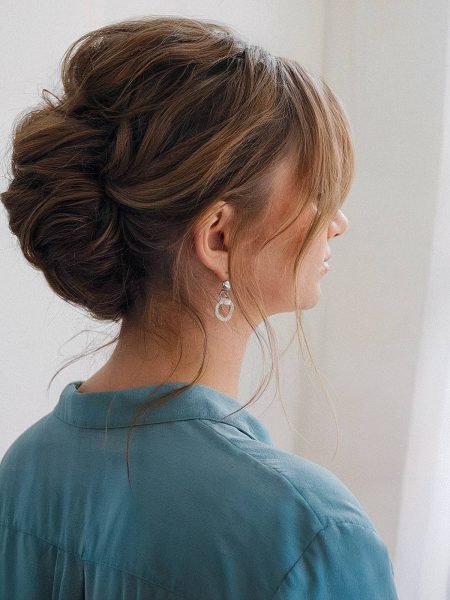 Select a stylish messy bun for your wedding day that will remain timeless in your cherished photos. It exudes softness and elegance, with strands of hair gently framing your face. The bun is arranged symmetrically, making it a perfect complement for most dresses.