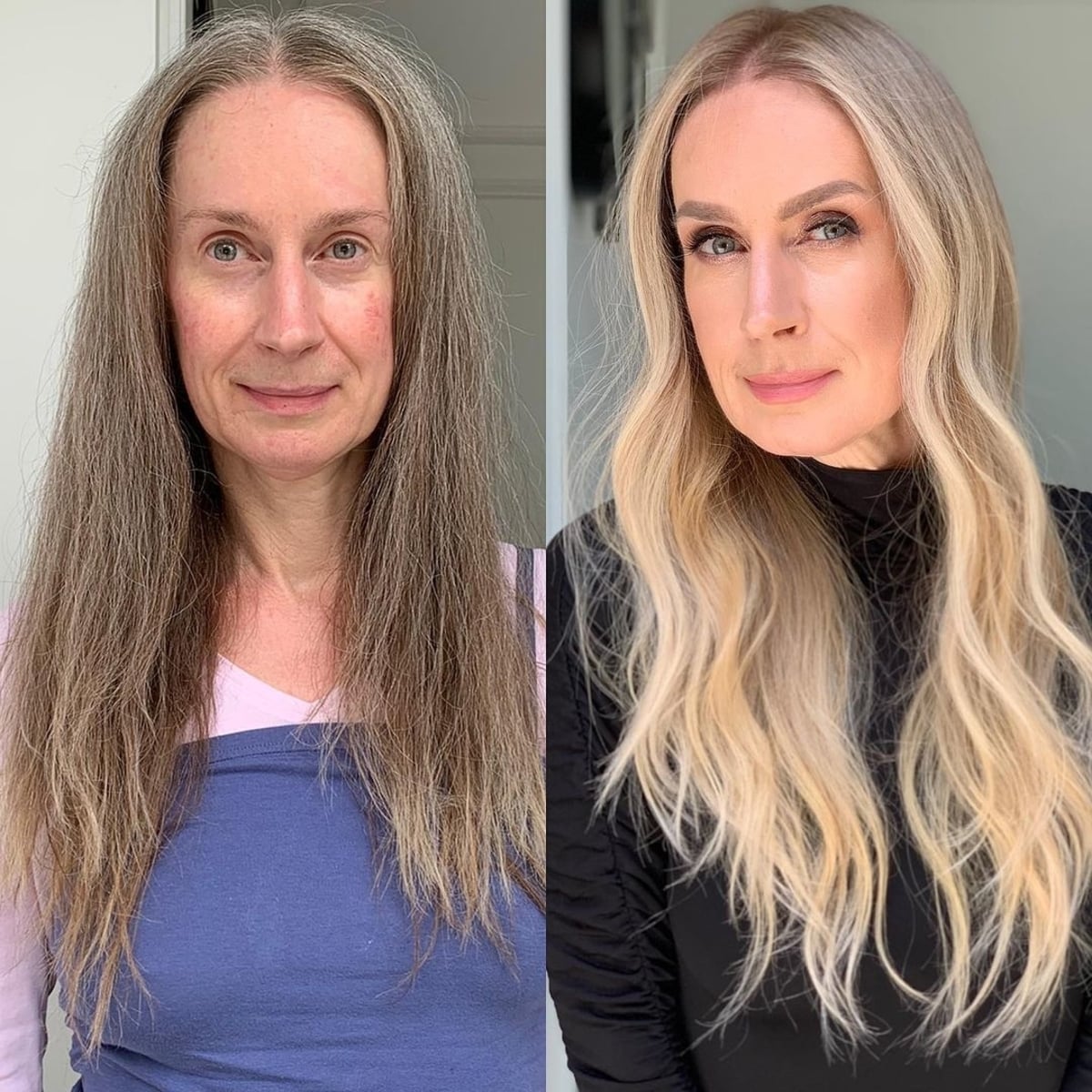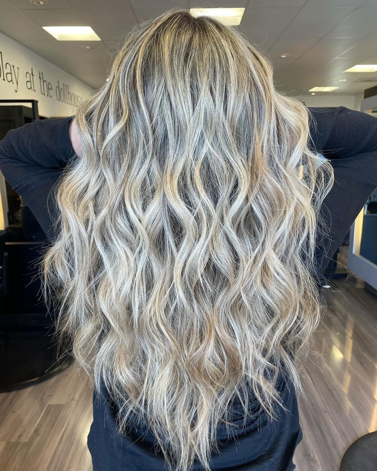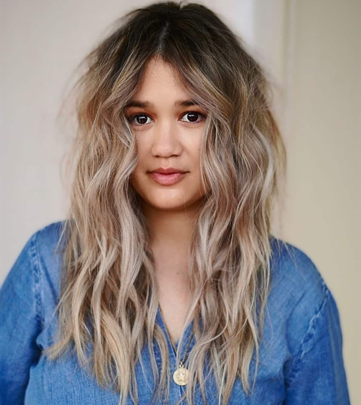 Bright highlights enhance the beige blonde undertone to create the illusion of fuller hair. Adding face-framing but minimal layers allows long, fine hair to maintain movement and length throughout. If your hair is finer and tends to droop as the day progresses, incorporating highlights can assist in creating texture and help your style last longer.