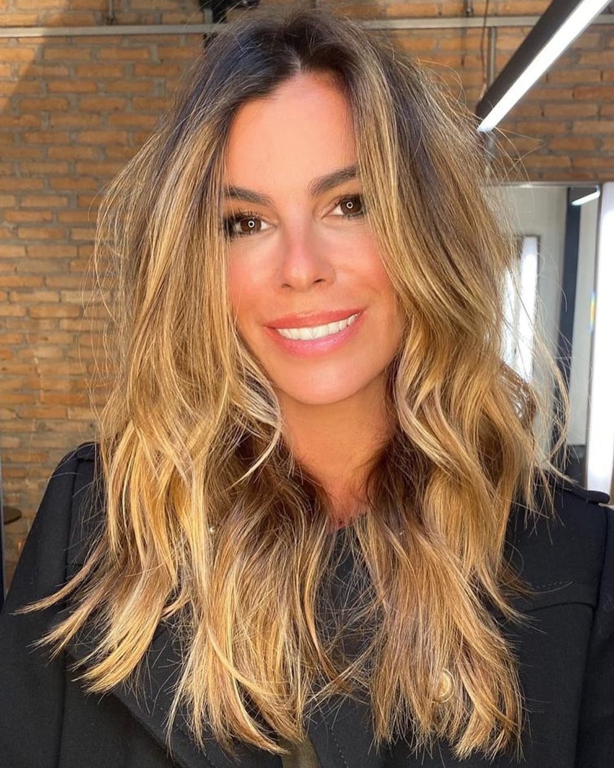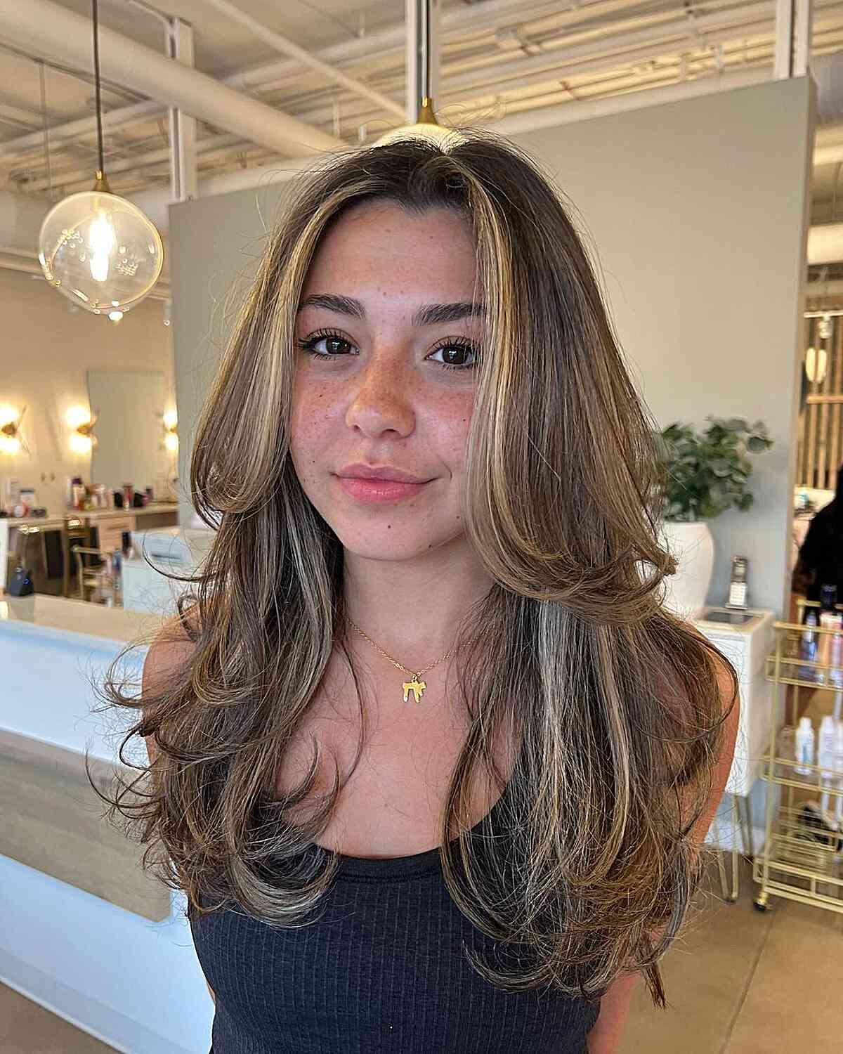 A long feathered hairstyle features face-framing layers that help to soften any facial structure. Babylights contribute to achieving this natural lived-in dimension. Additionally, it’s incredibly low-maintenance. For styling, utilize a root lift spray such as Moroccan oil. Blow-dry the roots initially, then employ a large round brush for styling.