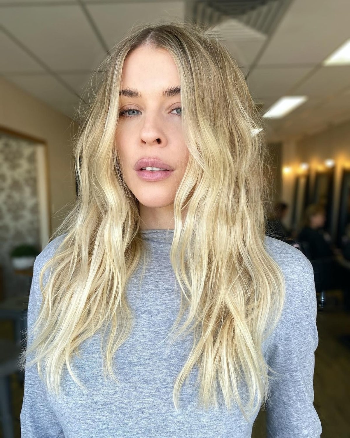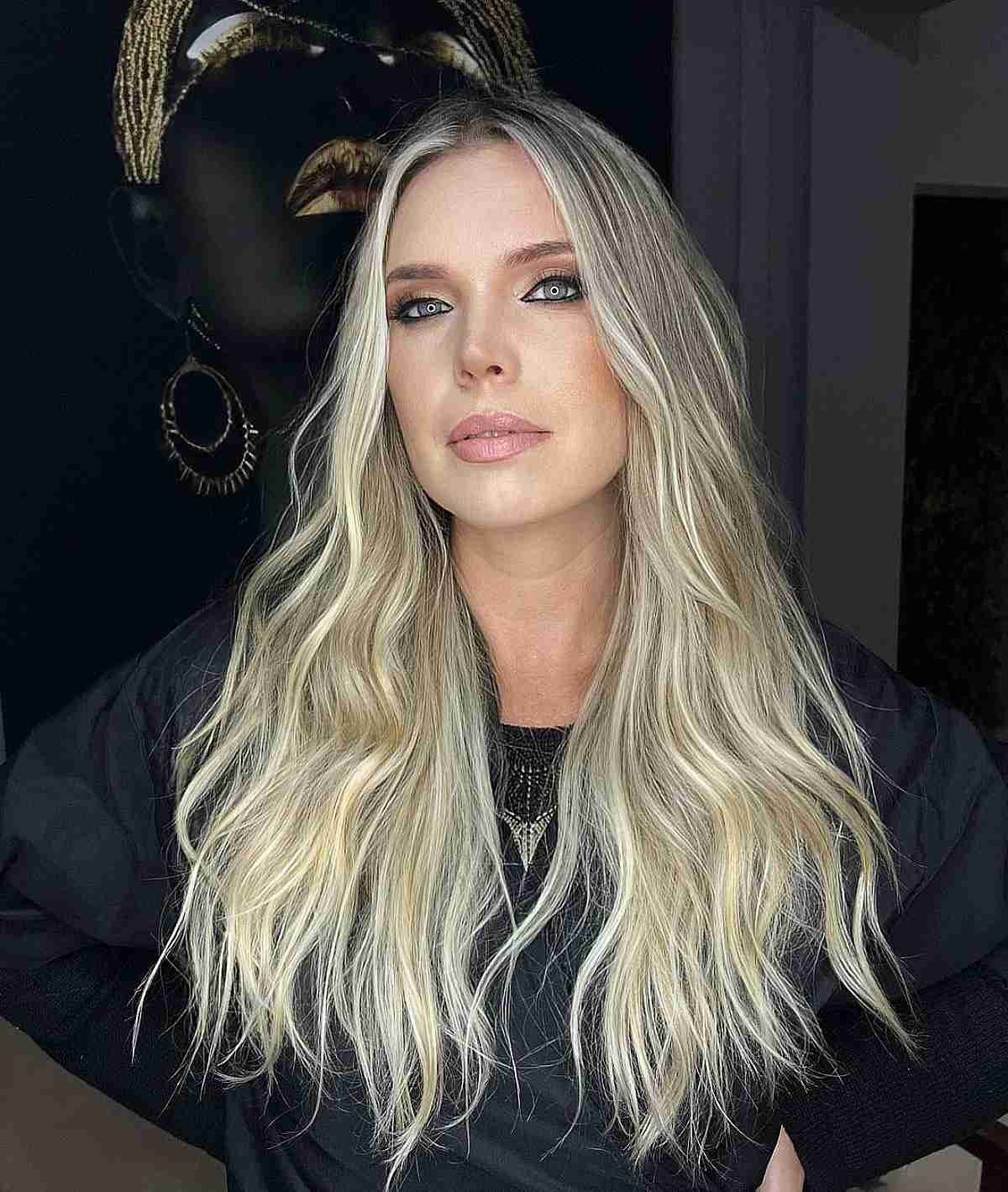 A stylish haircut can serve as a contour to your hair. A mid back-length haircut has the potential to elongate a face that is small or round. A hue like platinum blonde with a shadow root offers a seamless transition by connecting roots to mids and ends. When aiming to achieve a more voluminous look, a crimping iron provides lift when pressed at the root. Just style as usual. Once cooled down, run a comb through your hair to relax the curl and craft a lived-in look.