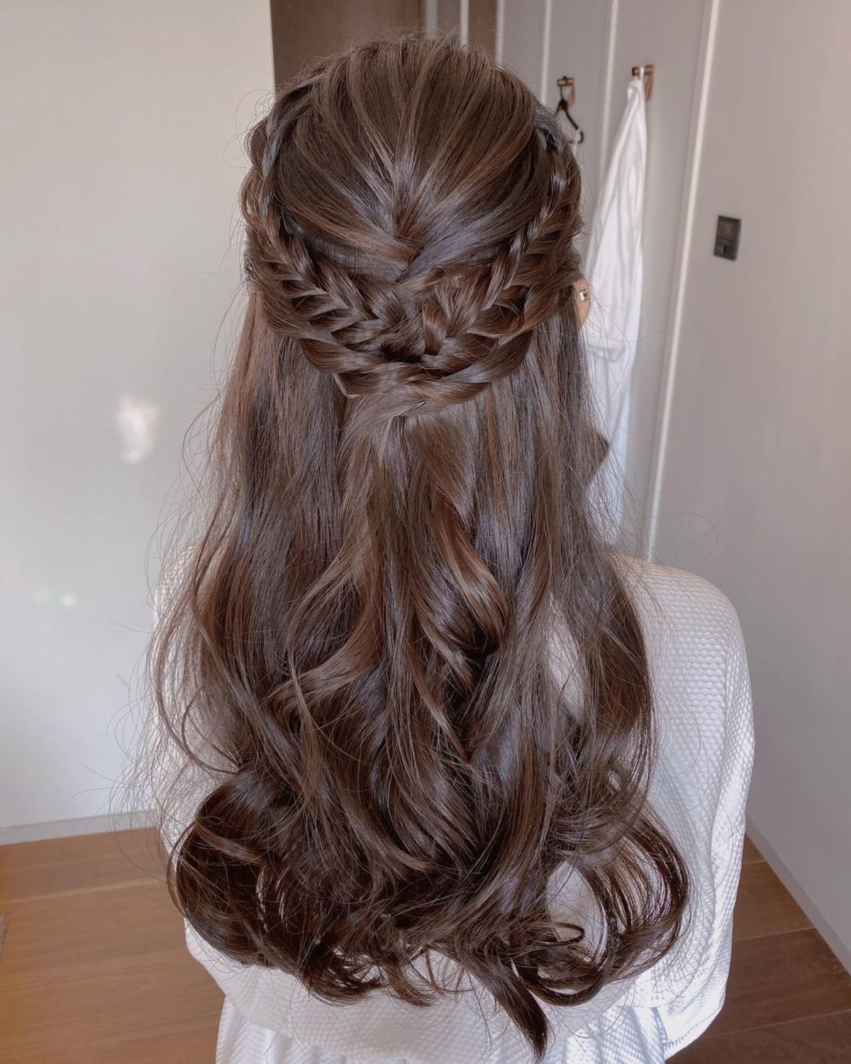 A half-up updo for long hair is an excellent way to refresh your look without it being too over the top. Experiment with various braids or twists and pull this out for a fuller appearance. Let some strands cascade around your face for added delicacy.