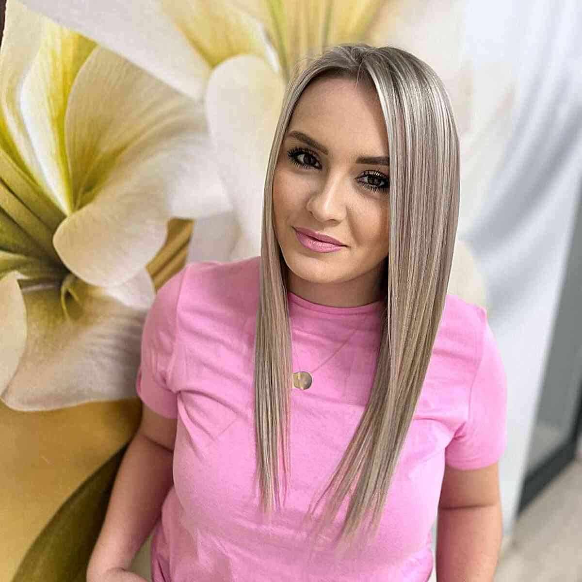 The elegant long blonde balayage with textured ends is a stunning hairstyle. It’s perfect for those seeking to enhance fullness, volume, and texture in their long straight hair. The balayage not only provides an optical illusion of thickness, but the layers will also give your fine hair body and dimension.