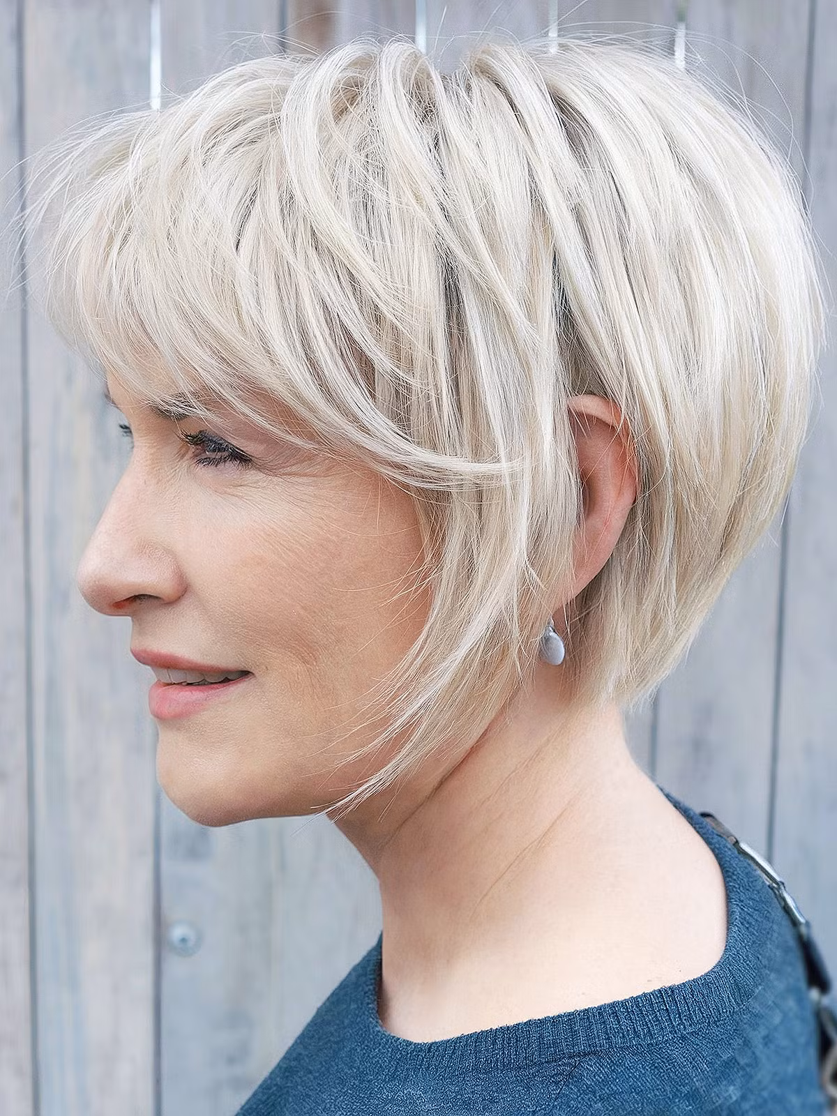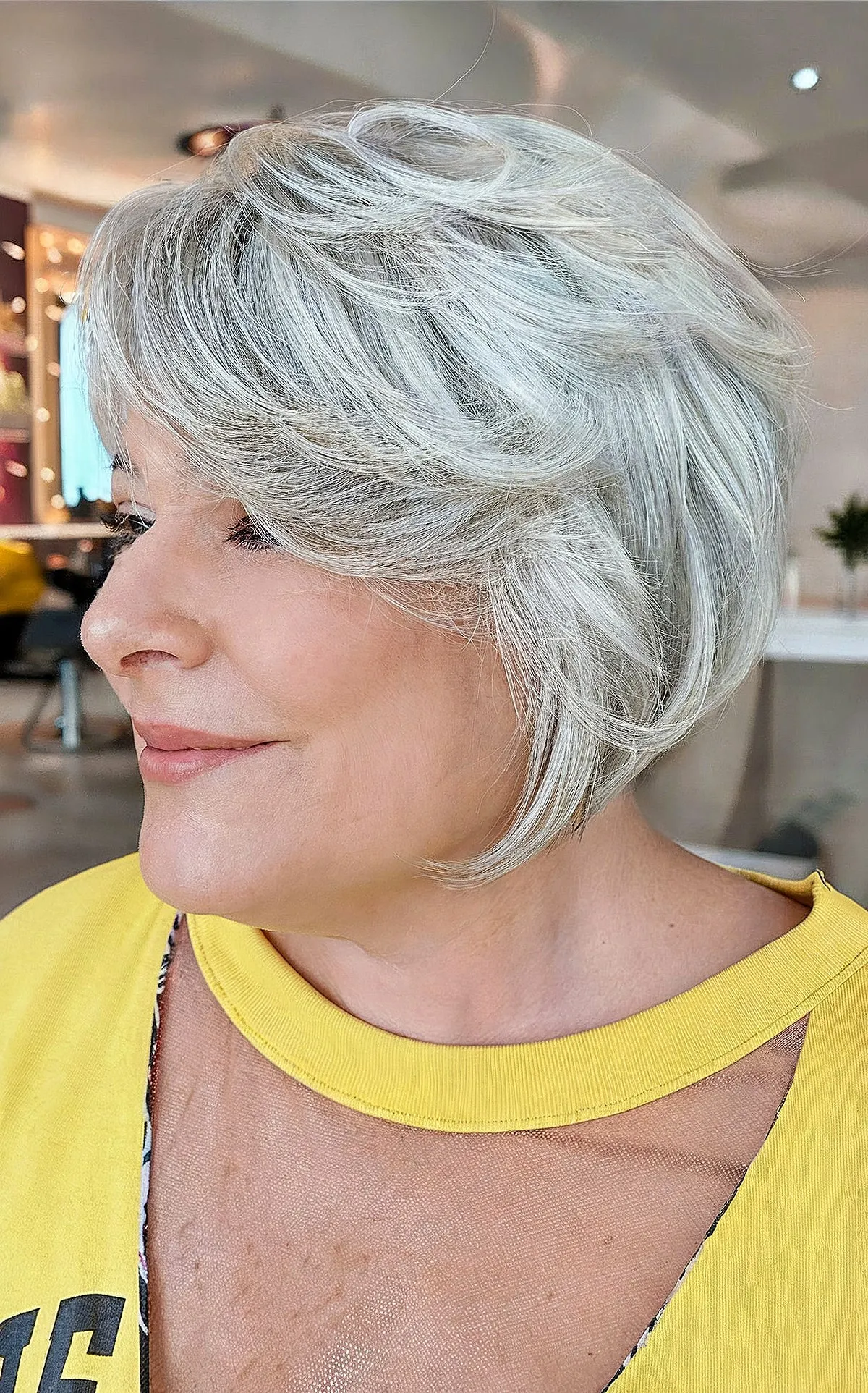 You’ll adore this textured, layered bob hairstyle featuring bangs. These hairstyles work wonderfully for women with fine hair, as they add volume to the shape, and the layers enhance the messy texture and body. Coloring your hair in a silver shade over a pre-lightened blonde base can provide you with a bright and modern appearance. It’s perfect for mature women looking to enliven their features. A short fringe introduces a playful element to the style and elegantly highlights the eyes.