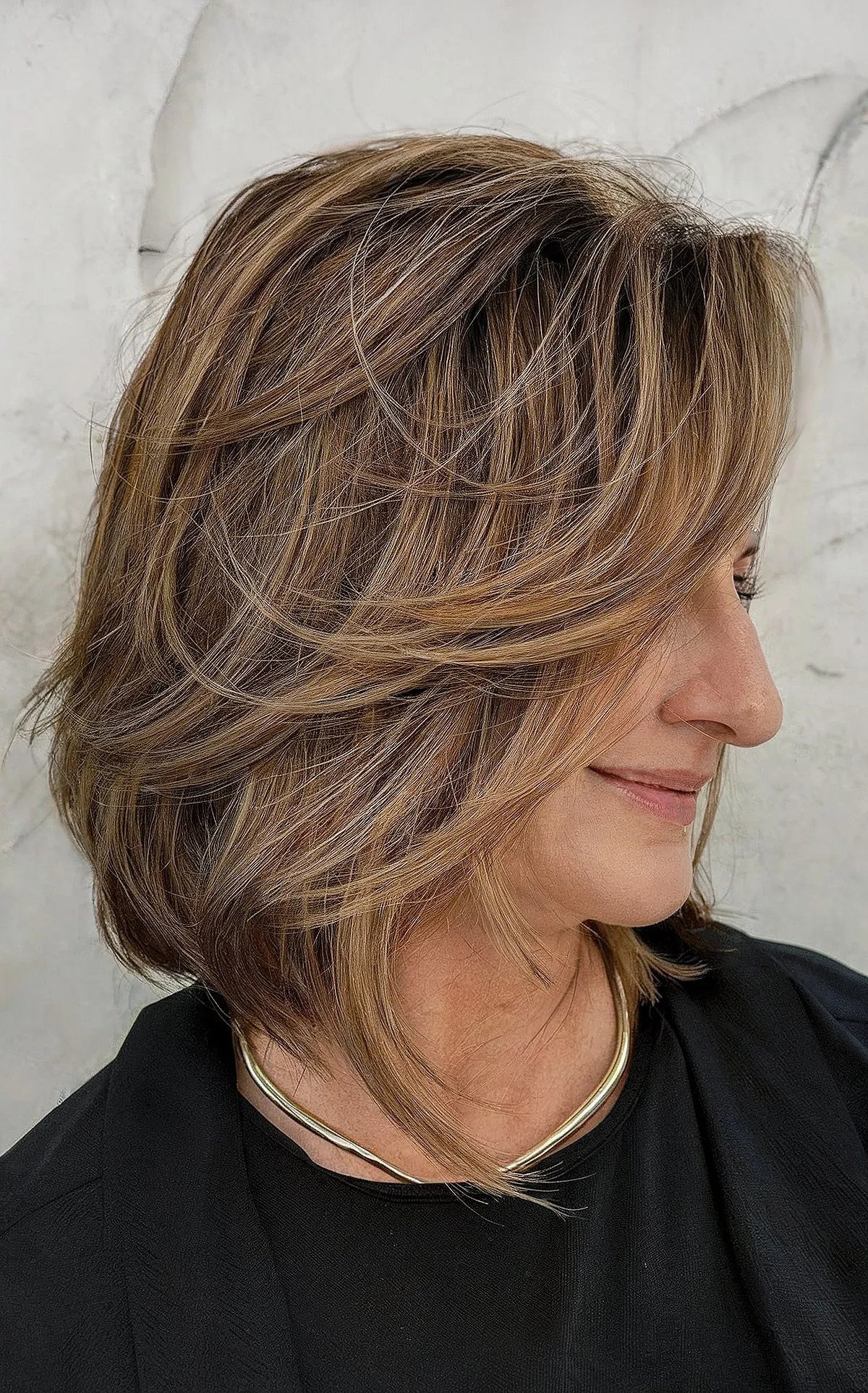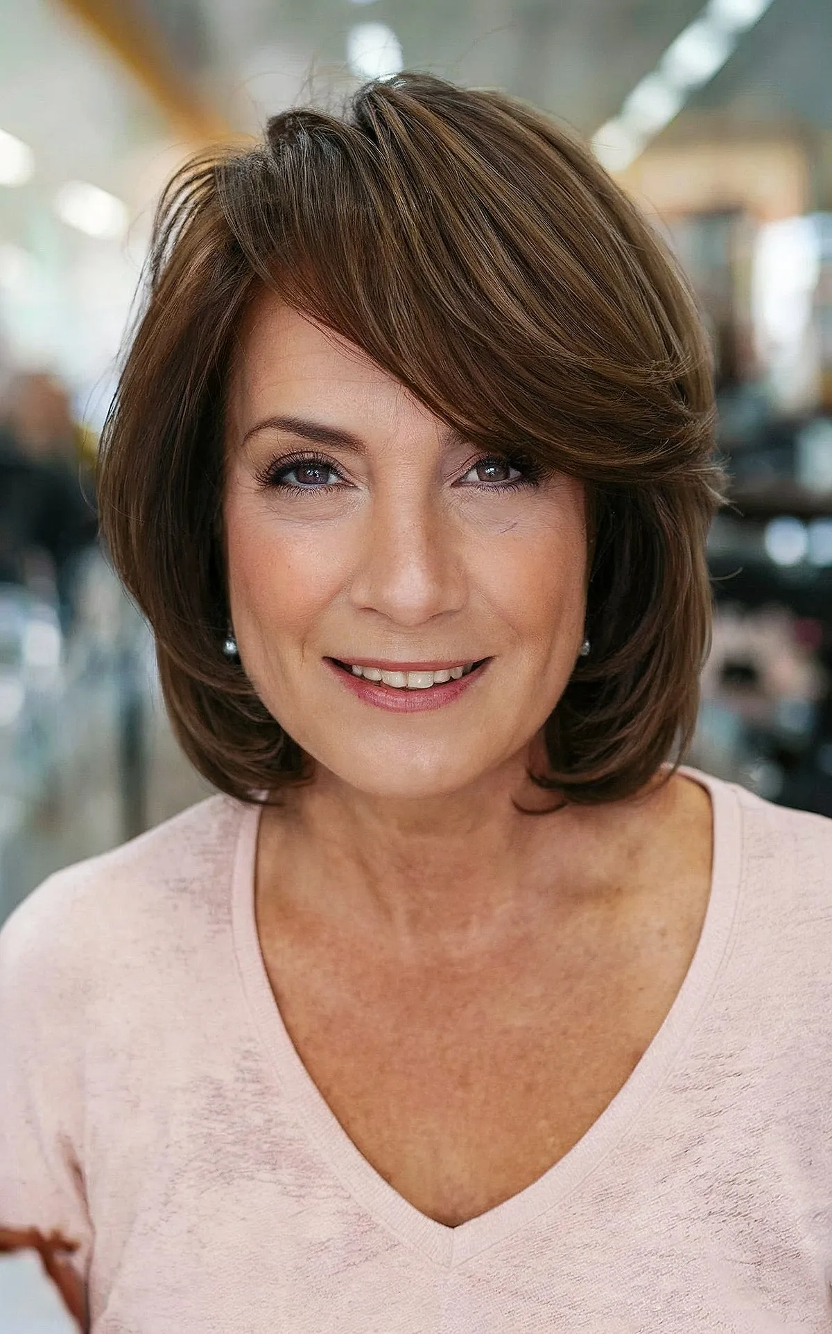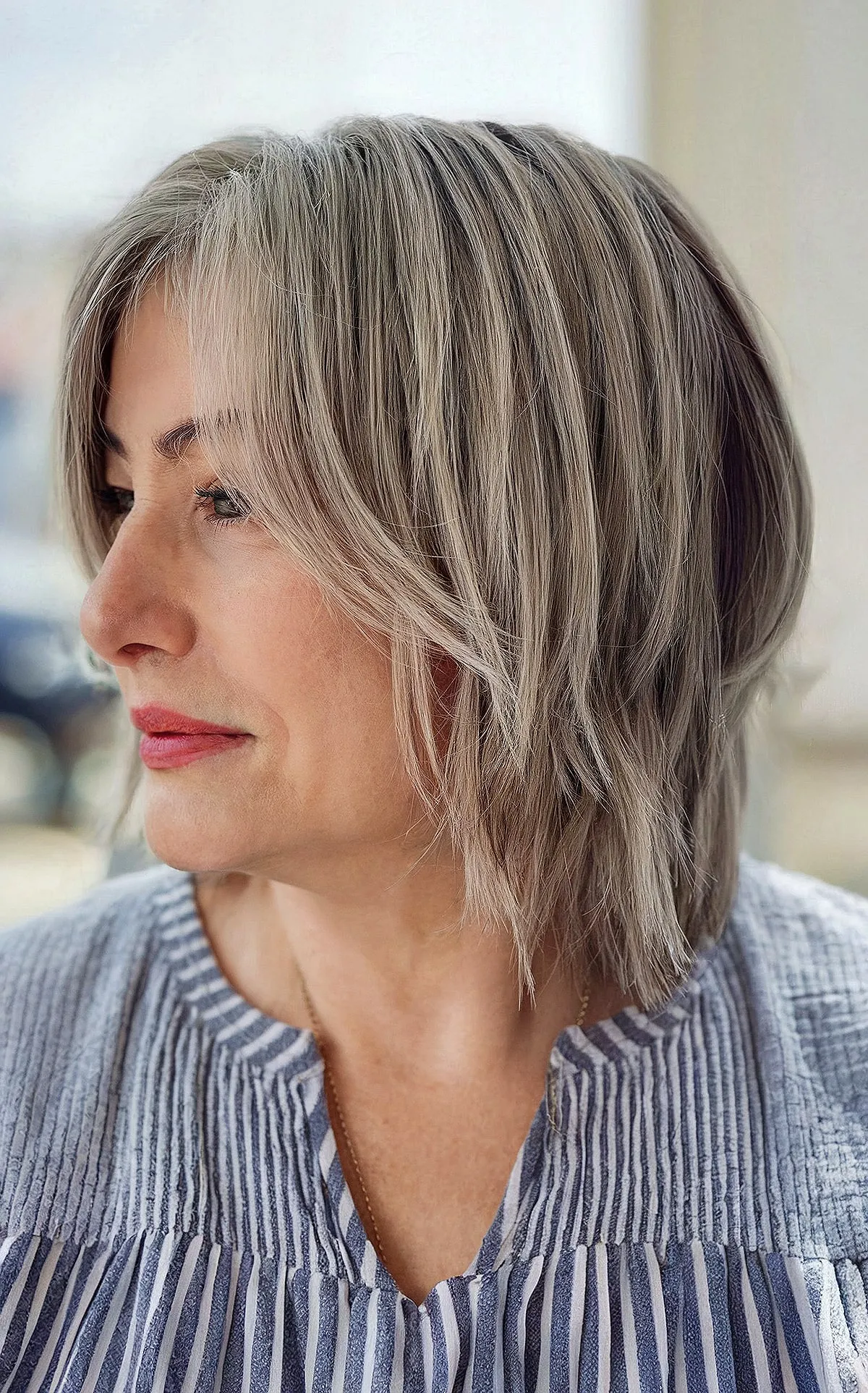 This chic layered bob is an excellent option for women over 50 with fine to medium-thick hair. The gentle, feathery layers create a sense of lightness and movement, while the side-swept bangs elegantly frame the face, making it perfect for round or square face shapes. The tousled texture adds volume, ideal for thinning hair. Styling with a round brush provides a polished finish, but the layered cut ensures it remains low-maintenance, making it easy to manage each day.