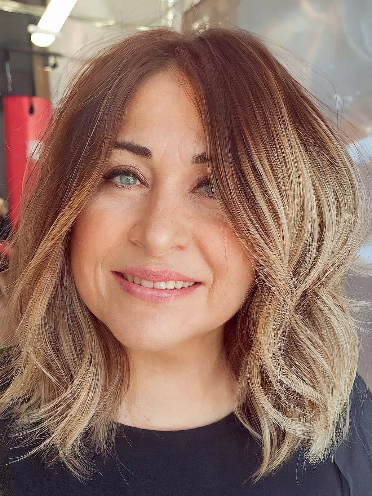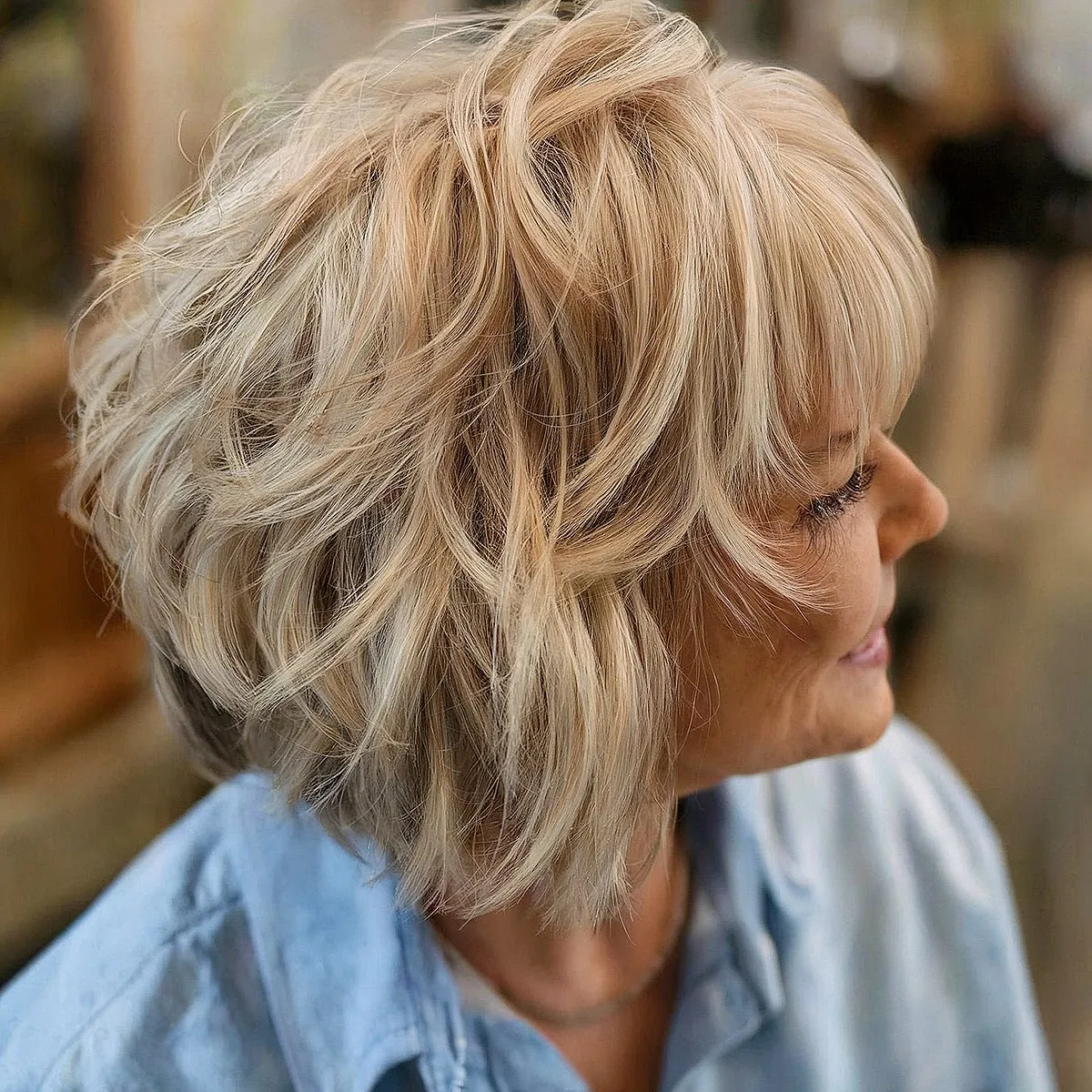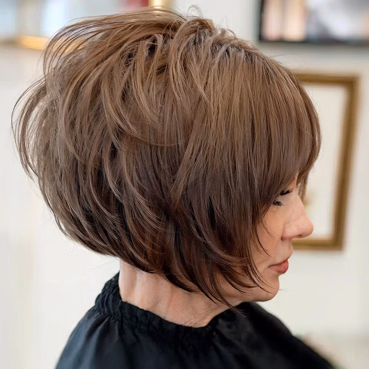 This chic layered bob is an excellent option for women over 50 with fine to medium-thick hair. The gentle, feathery layers create a sense of lightness and movement, while the side-swept bangs elegantly frame the face, making it perfect for round or square face shapes. The tousled texture adds volume, ideal for thinning hair. Styling with a round brush provides a polished finish, but the layered cut ensures it remains low-maintenance, making it easy to manage each day.