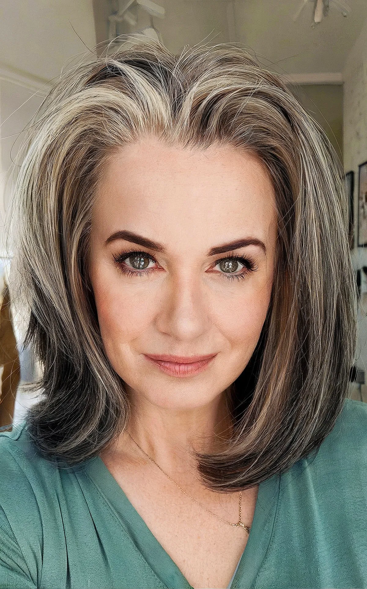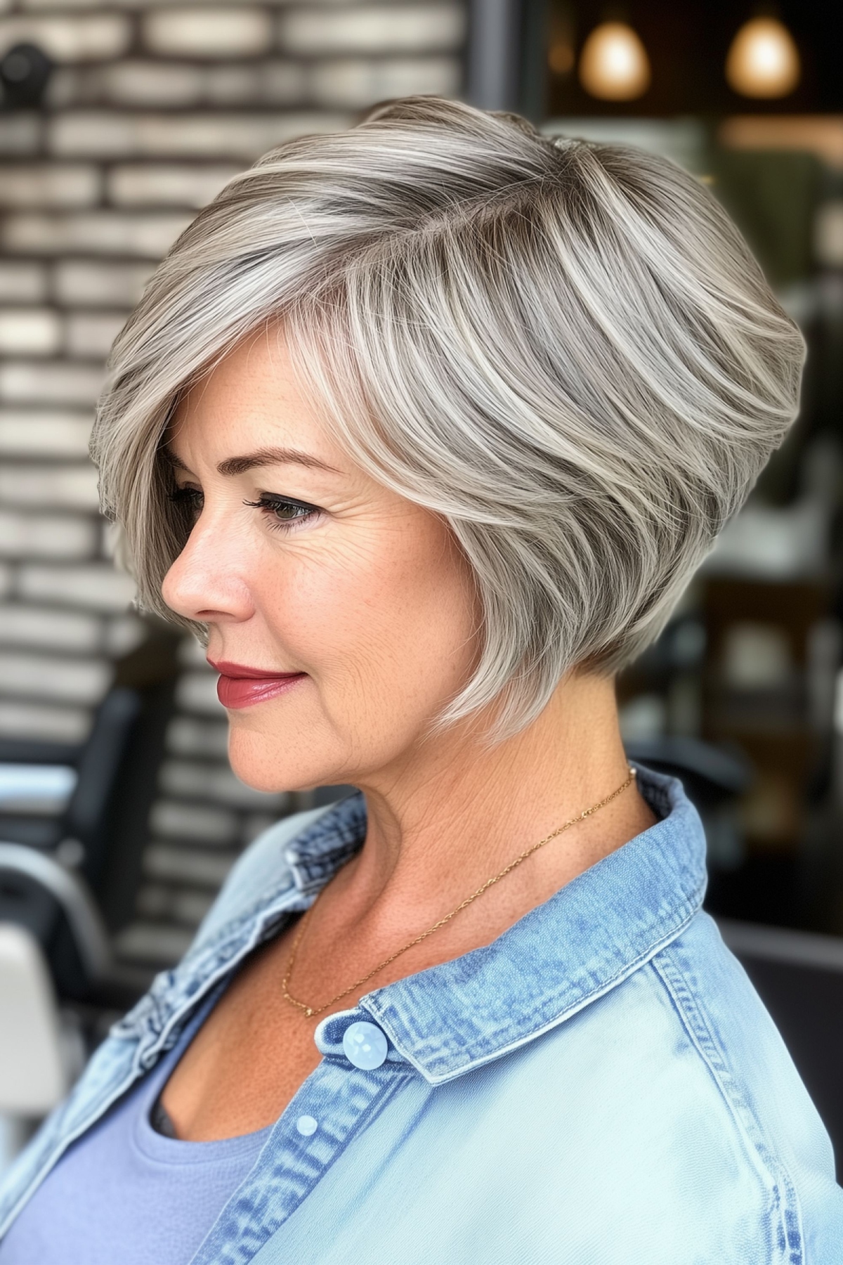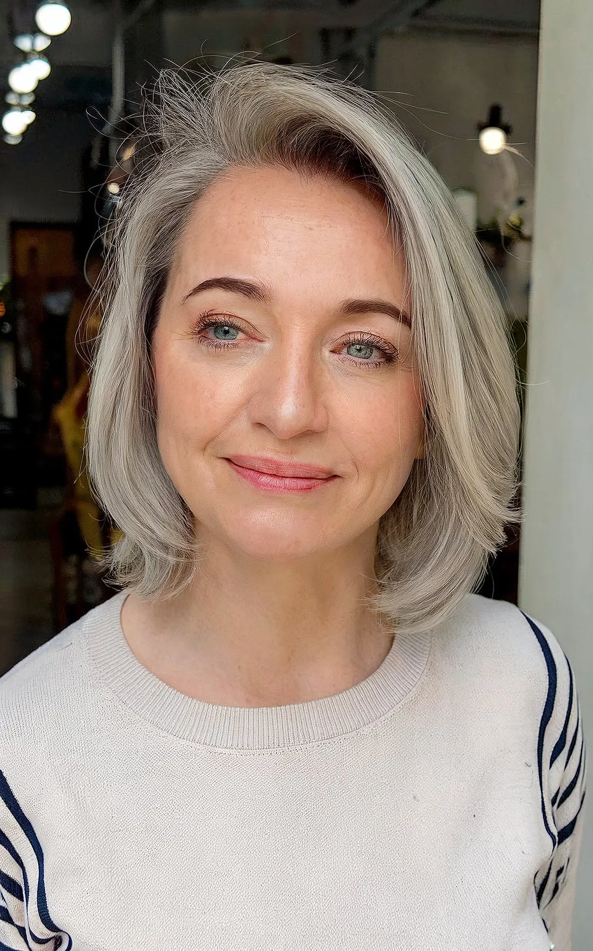 A bob could be a great choice if you have graying hair and seek a fresh, youthful haircut. Incorporating layers is an ideal way to enhance the face and add depth. This hairstyle suits women over 50 who wish to refresh their appearance. Regular trims every 6 to 8 weeks are essential to keep a vibrant and refined look.
