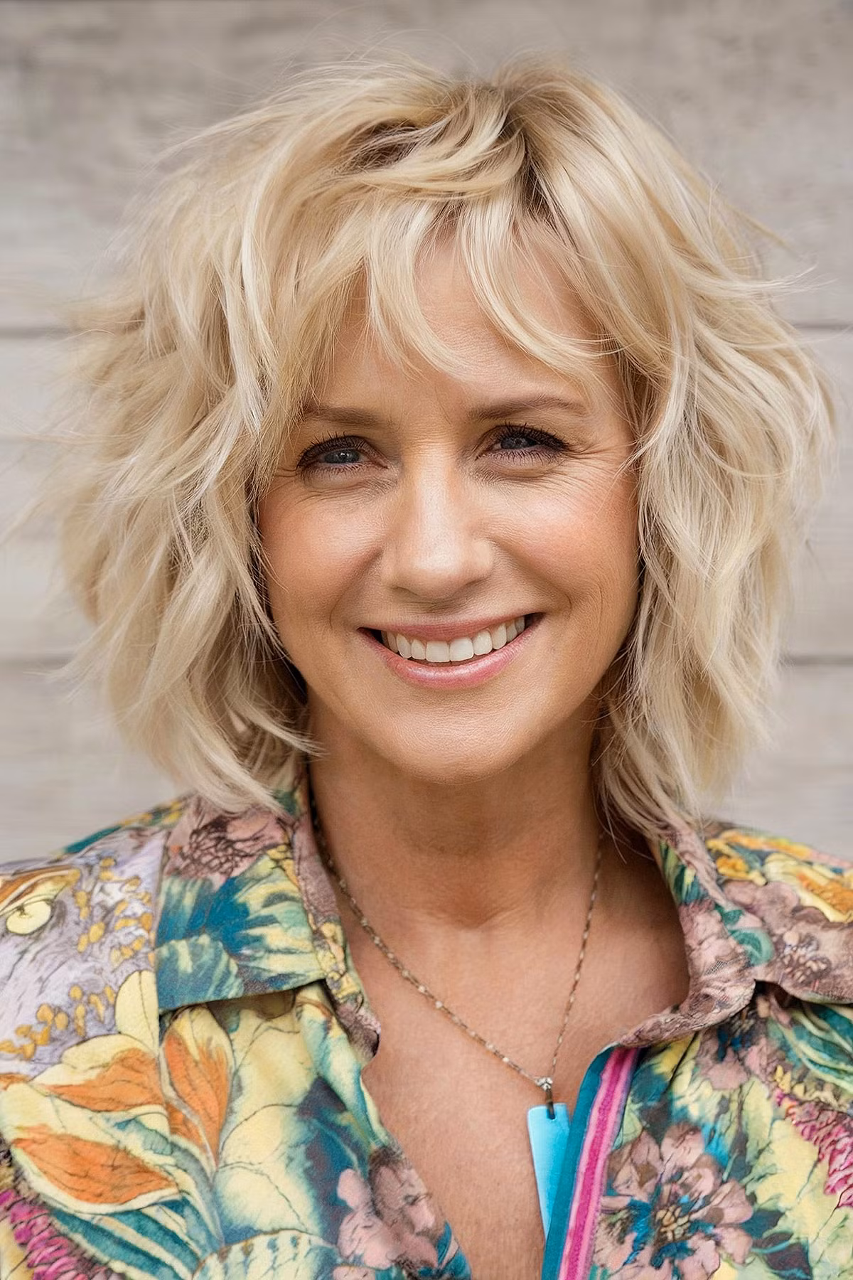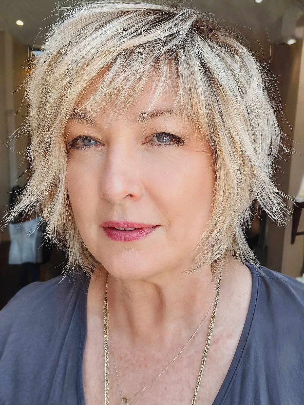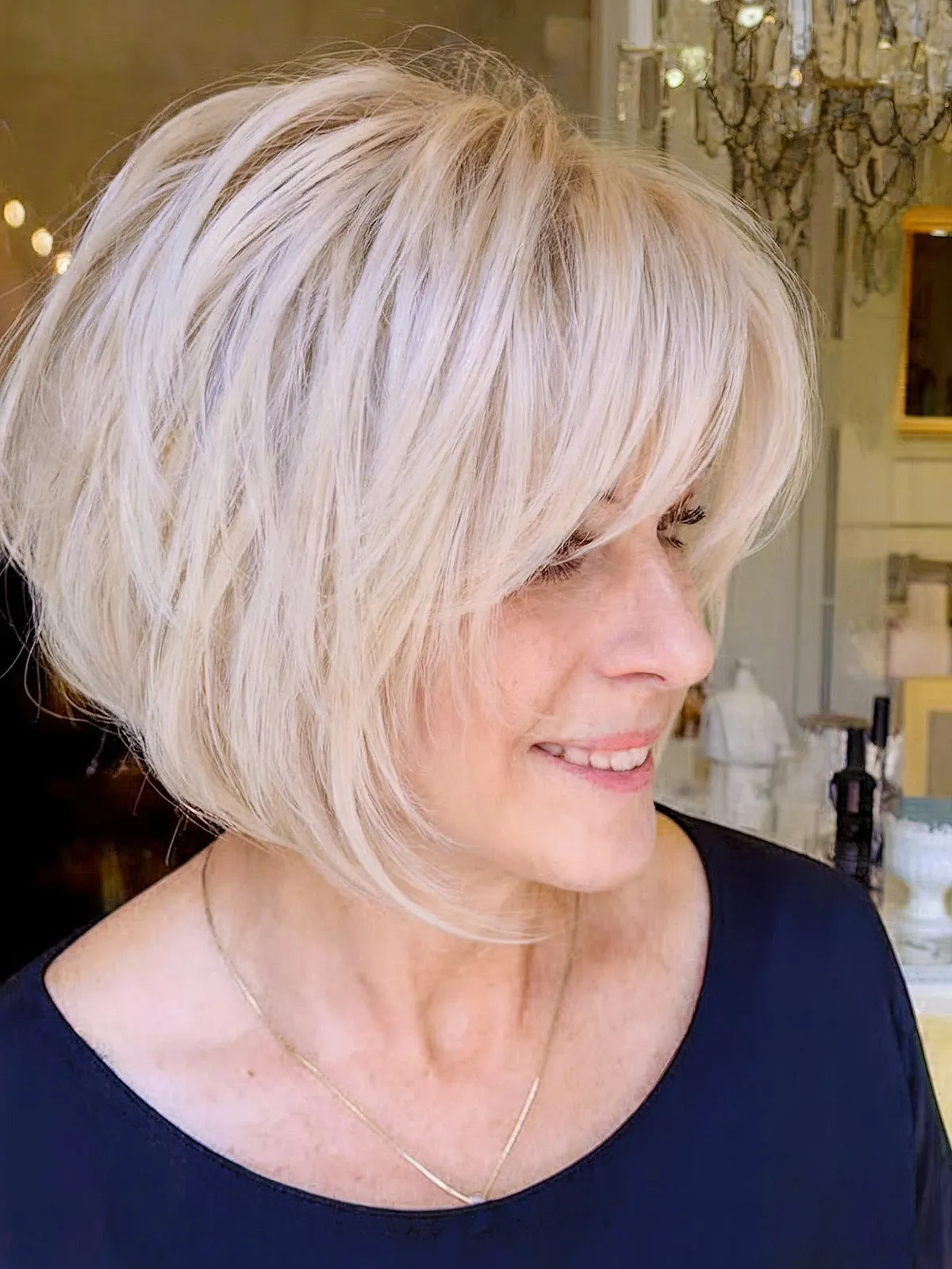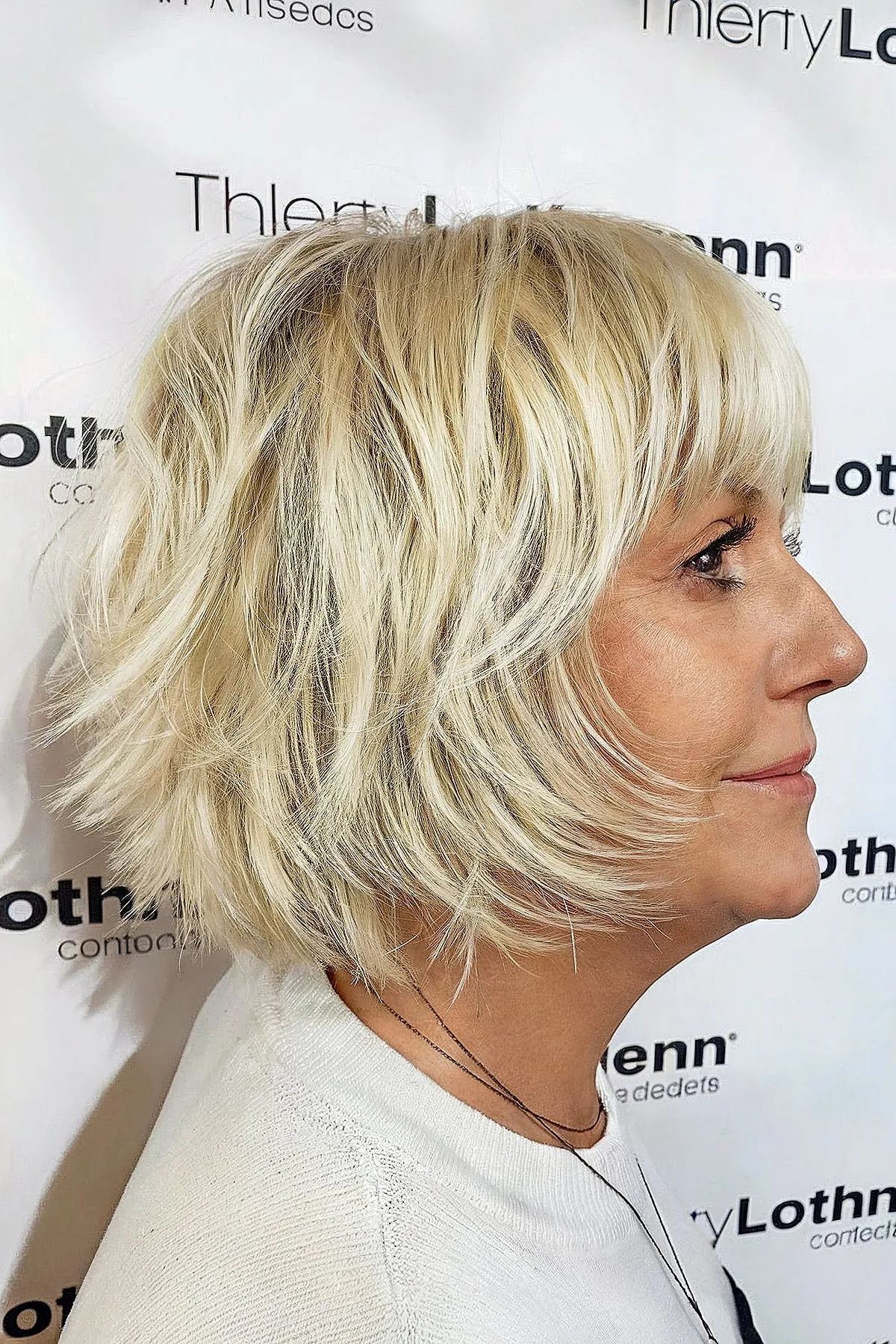 A blonde feathered bob with layered dimensions is an excellent choice for women over 50. This hairstyle can enhance movement and volume to the hair, making it appear fuller and more dynamic. It also offers a more youthful look as we age. This feathered texture creates softness and fluidity. As a result, the hairstyle takes on a youthful and feminine vibe. The blonde hue amplifies the layered effect, adding depth and highlighting the varying lengths of the cut.