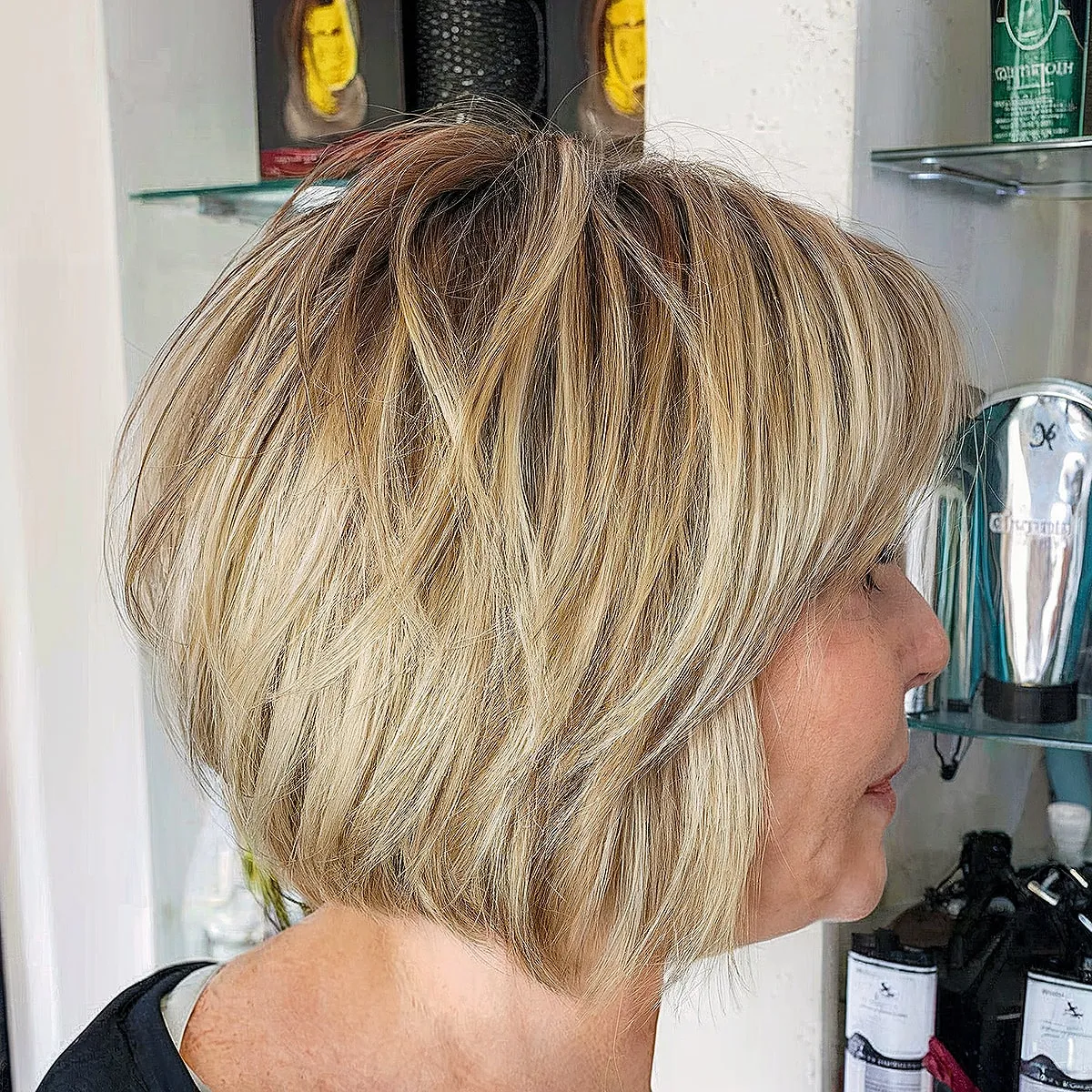 This layered and textured blonde bob is an excellent option for women over 50 seeking to add volume and depth to fine or medium hair. The shorter, stacked layers in the back lift the crown, creating a fuller look, while the face-framing layers introduce a touch of softness. Perfect for those with naturally wavy or straight hair, this cut is simple to style with a round brush or flat iron for definition. The blonde highlights elevate the texture and movement, resulting in a youthful, contemporary appearance.