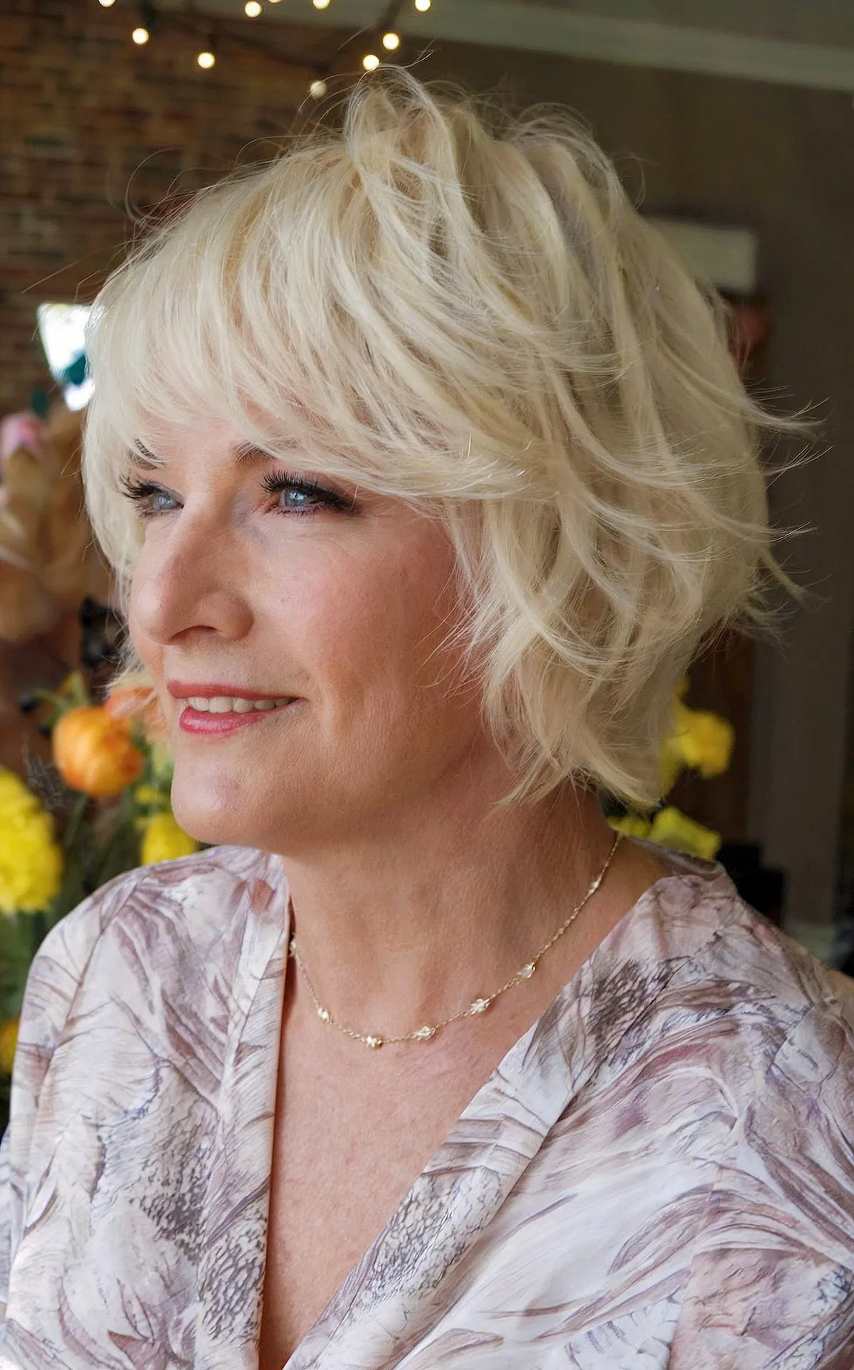 With my years of experience, I’ve learned a bob with distinct layers is one of the top hairstyles for mature hair. Not only will blonde brighten your appearance, but the light yet distinct layers also enhance the volume often diminished as we get older.