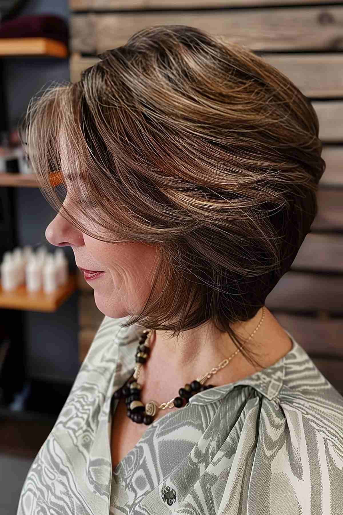 This elegant layered bob is ideal for women over 50 who desire a fresh yet sophisticated hairstyle. The voluminous layers create movement and body, while the side-swept bangs elegantly frame the face. Perfect for medium to thick hair, this cut helps achieve a fuller look. Styling is simple with a round brush and a light texturizing spray, providing a polished appearance with little effort. This haircut is excellent for adding dimension and highlighting natural texture.