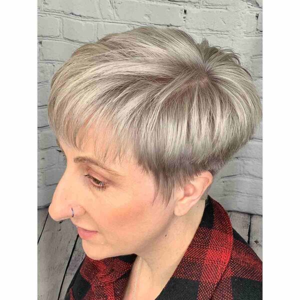 Consider a short haircut with soft layers and ash blonde highlights and lowlights if you seek an easy styling routine. A cropped cut is ideal for women who have only a few minutes to dedicate to their hair. The back resembles a stacked bob in that it provides volume to the back of your head.