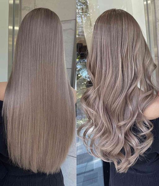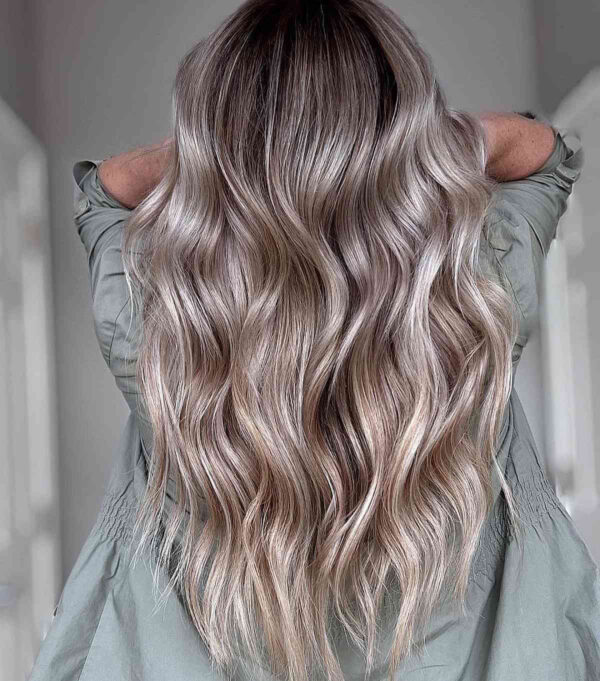 The smooth blend from a dark ash blonde shade to lighter tones creates a contemporary and expansive look. The cool hues and balanced tones showcase her stunning long hair beautifully. Check your hair’s health to determine if it can handle the process before proceeding. Minimize the use of hot styling tools to preserve your color, and ensure it complements your skin tone.