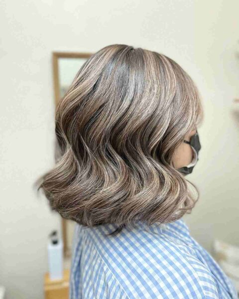 This gorgeous hairstyle showcases iridescent pearl ash blonde babylights with a smudged root and stylish beach waves. What I adore most about this bob haircut and the hue is the silver pearl toner we used for this stunning hair color trend.